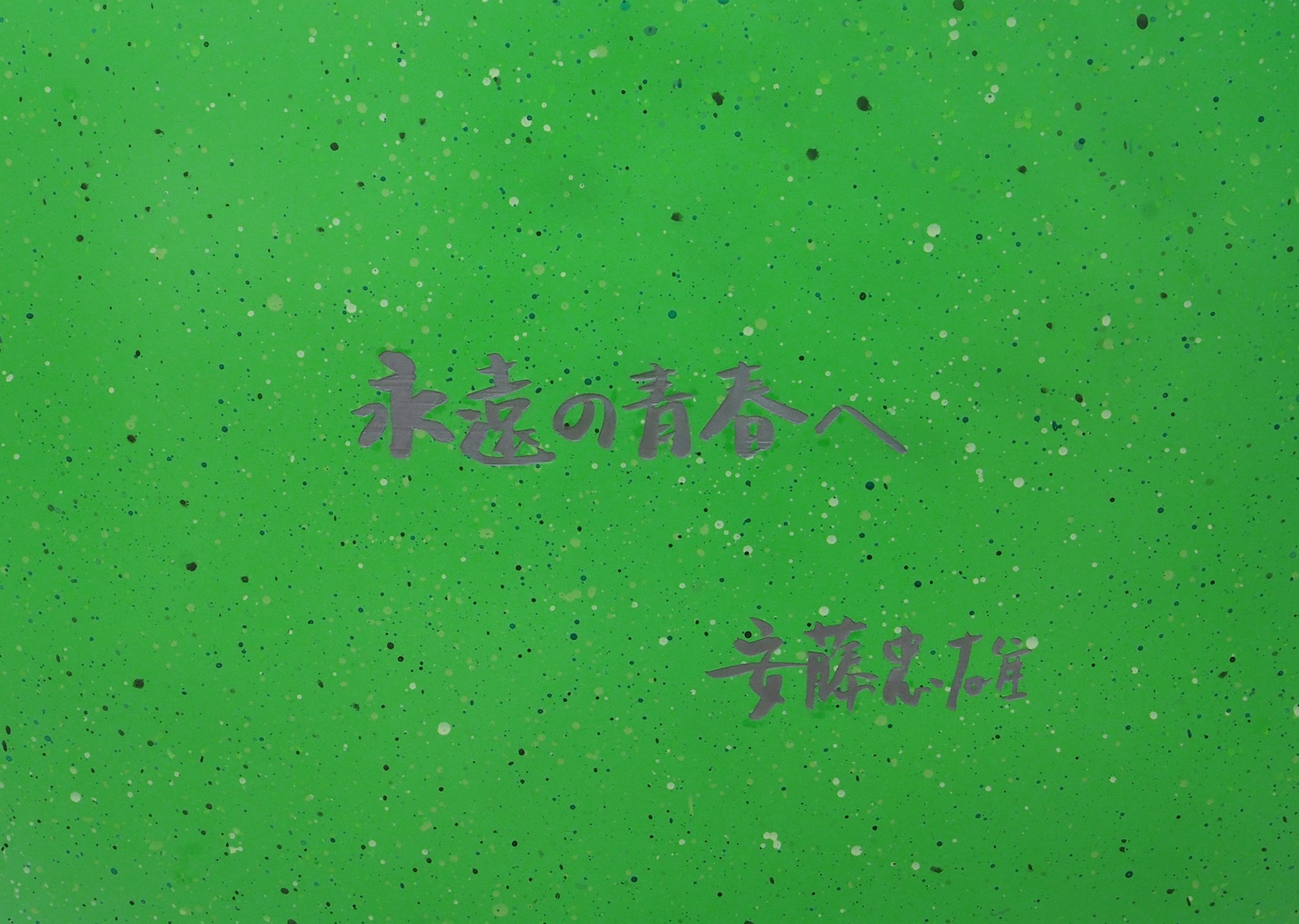 前面に広がる芝生広場には、本展のテーマ「青春」を象徴する直径2.5mの「青りんご」のオブジェを設置、来訪者を会場にいざなう。オブジェの台座には詩人サムエル・ウルマンが謳う「青春」の詩とともに、安藤氏のメッセージが刻まれている。