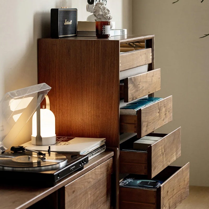 ウォールナット材で作り上げた天然木五段チェストは、高級感溢れる美しい仕上がりが特徴です。深さの異なる引き出しで、さまざまな収納ニーズに対応。脚付きデザインにより、掃除ロボットが通れるスペースを確保し、掃除もしやすく便利です。