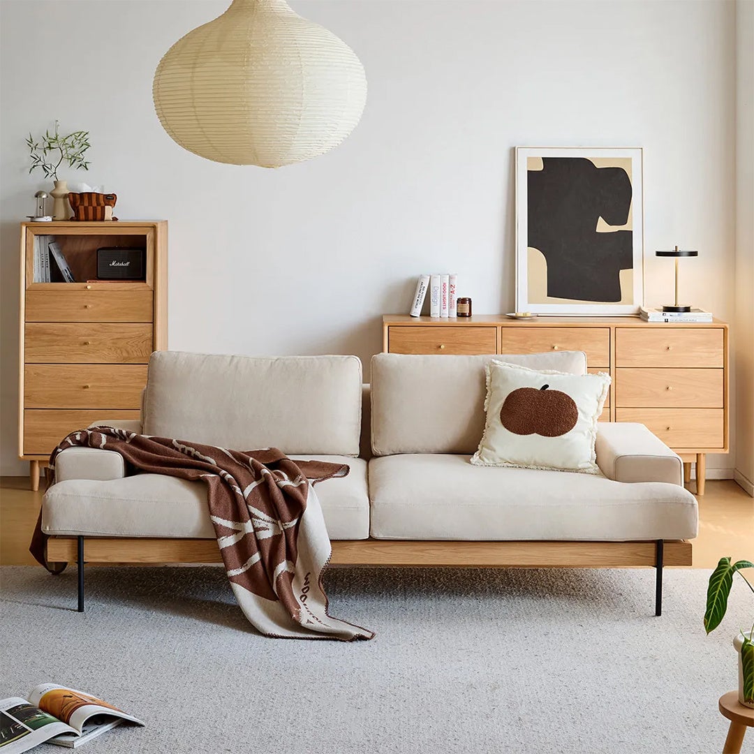 天然木のホワイトオーク材を使用した高級ソファ。洗練されたデザインで圧迫感がなく、部屋を広々と見せてくれます。高反発クッションで快適な座り心地を提供し、長時間の使用でも疲れにくい設計。カバーは取り外し可能で手軽にお手入れができ、いつまでも清潔にご使用いただけます。
