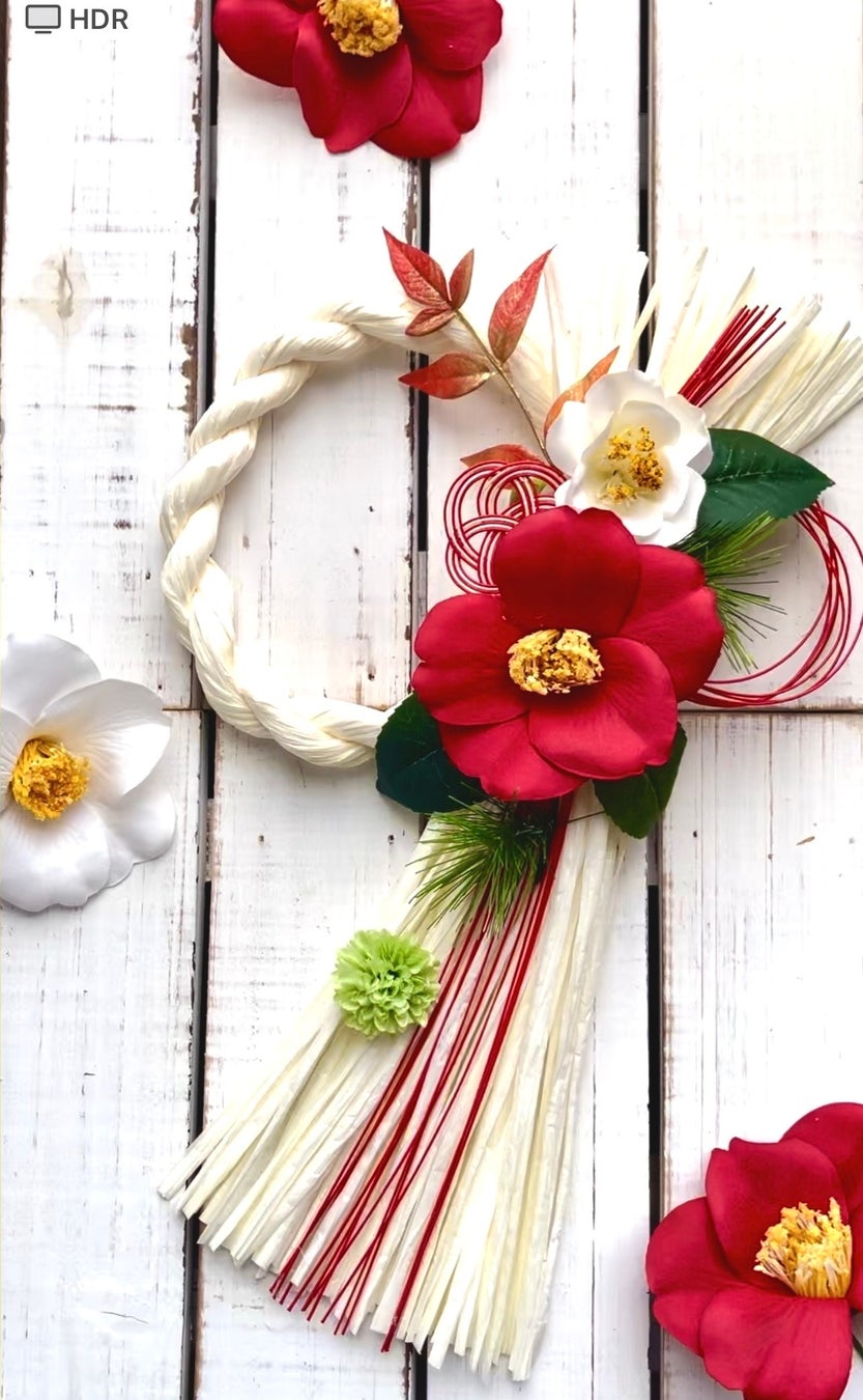 紅白の椿と水引きを使ってお正月を華やかに彩るしめ飾りを作ります。