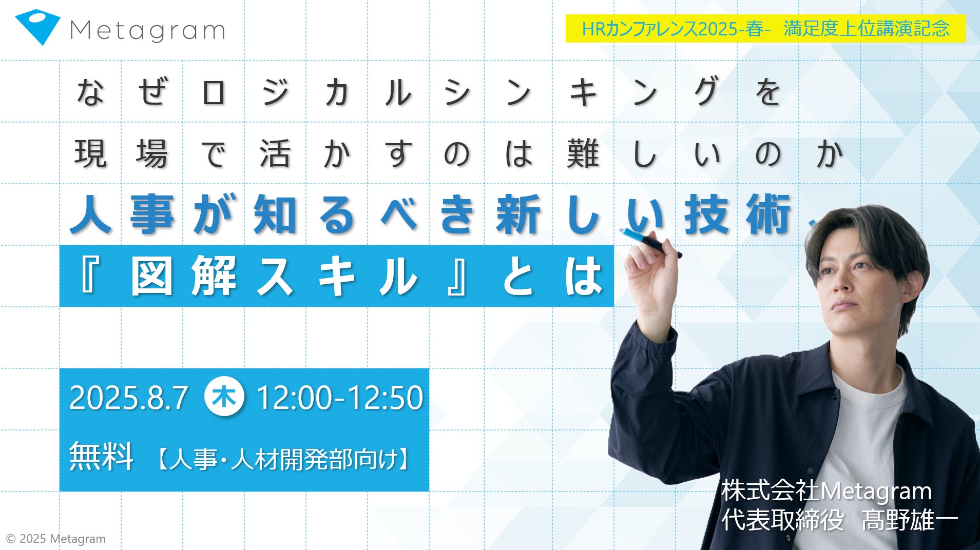 図解思考を用いた人材育成サービスを提供する株式会社Metagram(本社:東京都渋谷区、代表取締役:髙野雄一)は、2025年5月14日〜22日に開催された日本最大級の人事カンファレンス「日本の人事部 HRカンファレンス2025-春-」(後援:厚生労働省)にて、当社代表・髙野雄一が登壇した特別講演『なぜロジカルシンキングを現場で活かすのは難しいのか 。人事が知るべき新しい技術、「図解スキル」とは』が、満足度上位講演(全176講演中6講演のみ選出)に選ばれました。