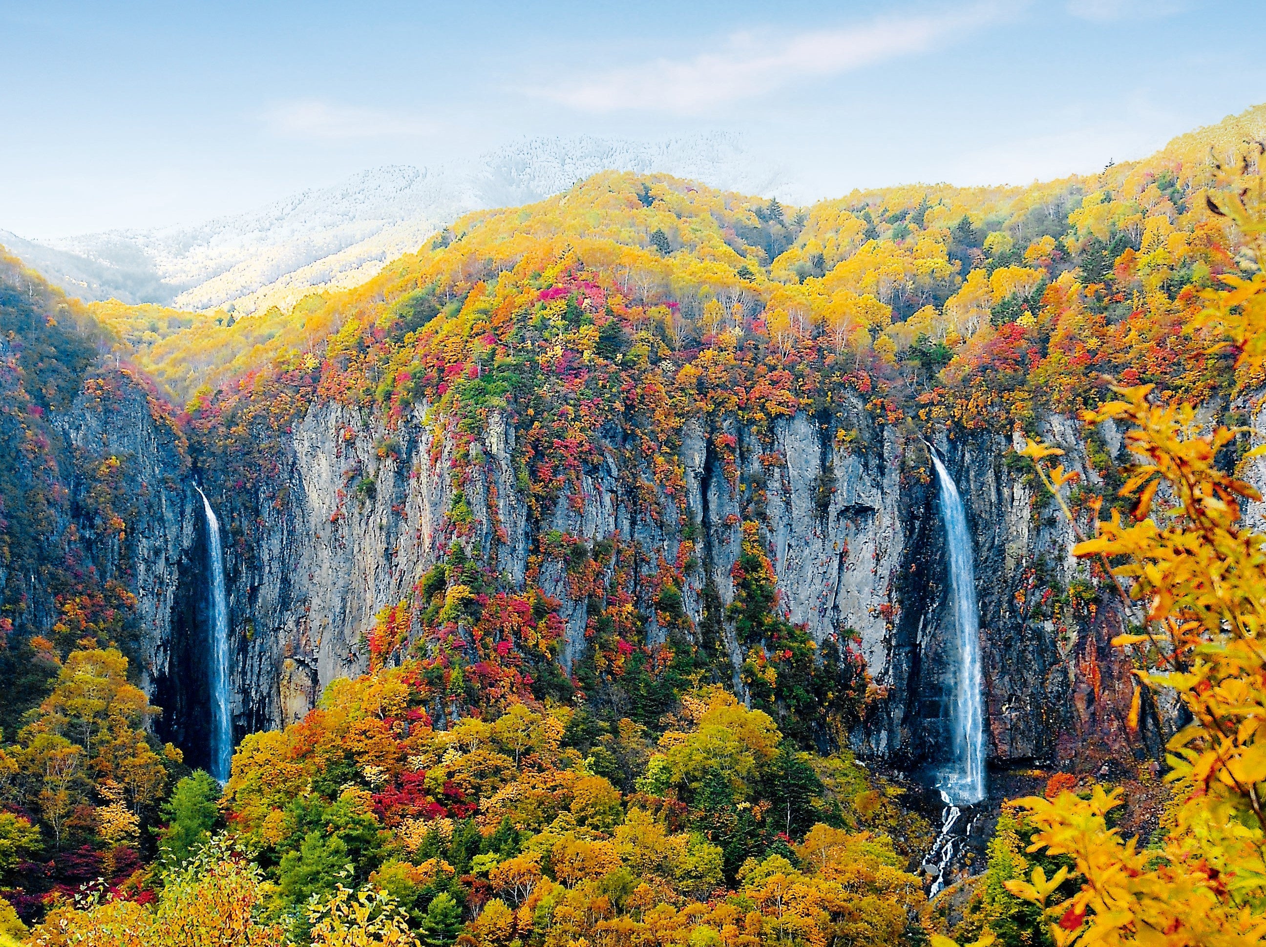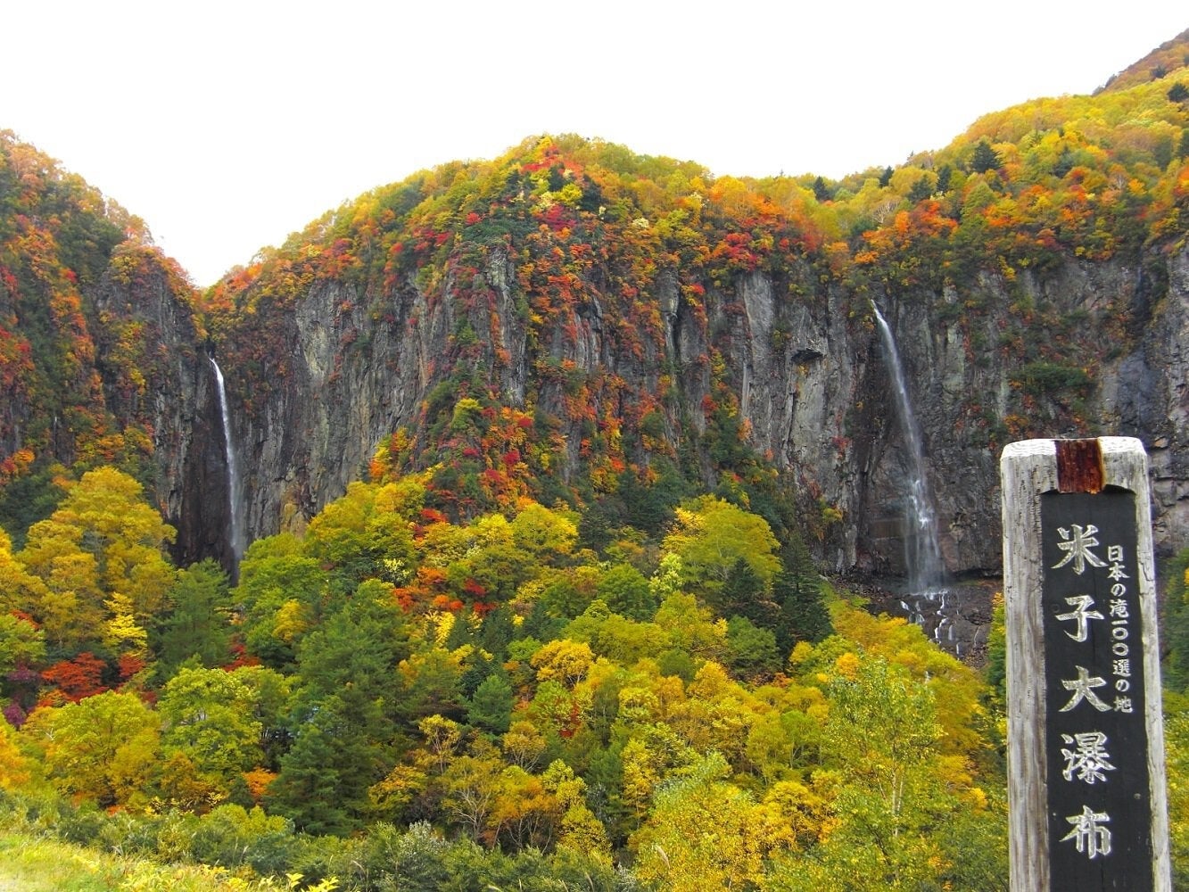 壮大な二条の滝と紅葉のコントラスト 米子大瀑布(日本の滝百選・国指定名勝「米子瀑布群」)、秋の絶景と紅葉を満喫!