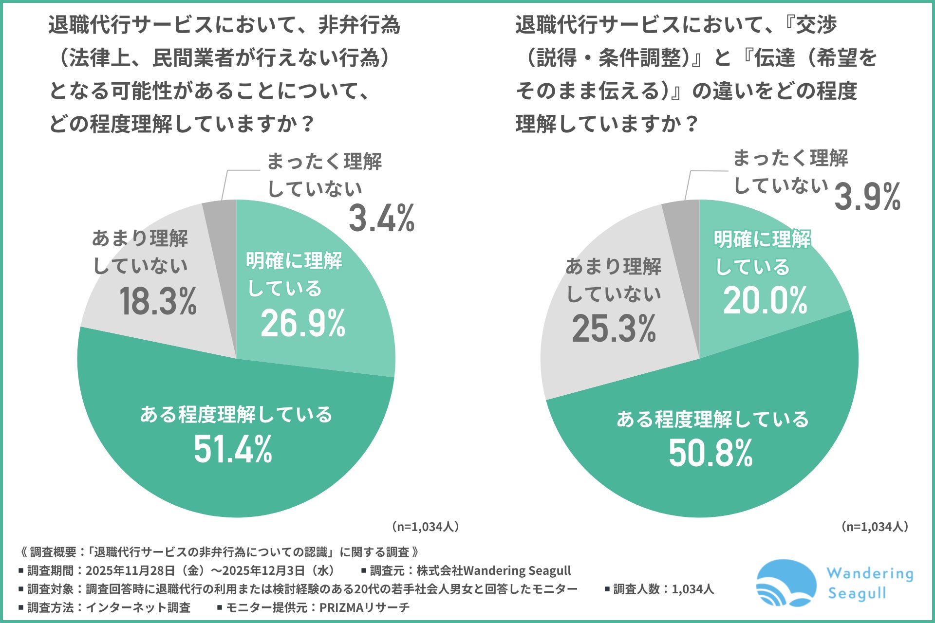 そこで今回、退職代行サービス『だいじょうぶ』(https://daijoubu.jp/)を運営する、株式会社Wandering Seagull(https://www.wandering-seagull.co.jp/)は、退職代行の利用または検討経験のある20代の若手社会人男女を対象に、「退職代行サービスの非弁行為についての認識」に関する調査を行いました。