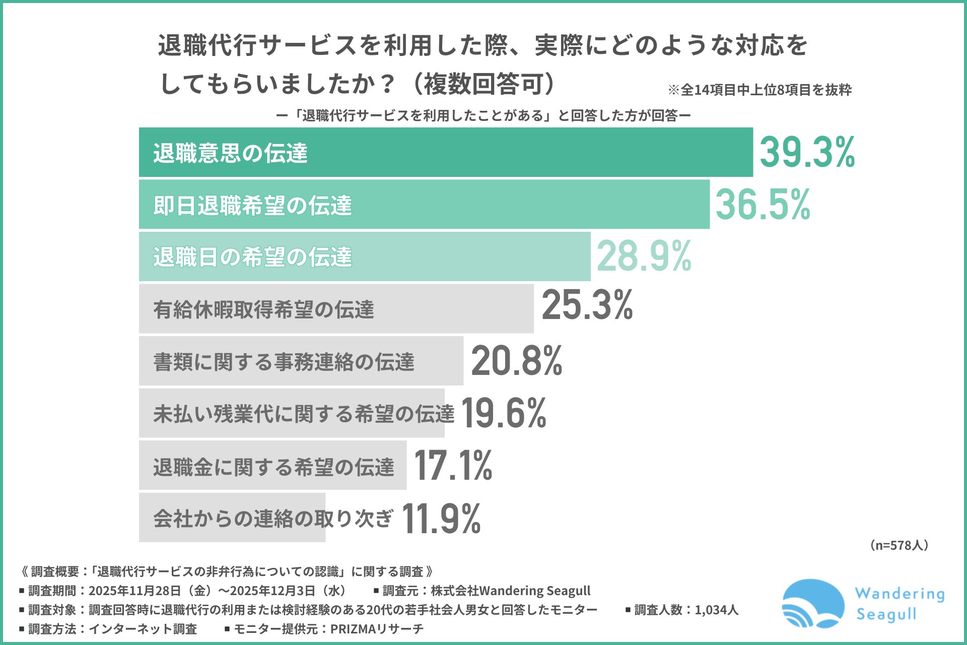 「退職代行サービスを利用した際、実際にどのような対応をしてもらったか」と尋ねたところ、『退職意思の伝達(39.3%)』『即日退職希望の伝達(36.5%)』『退職日の希望の伝達(28.9%)』など、「利用者の希望の伝達」が上位に挙がりました。