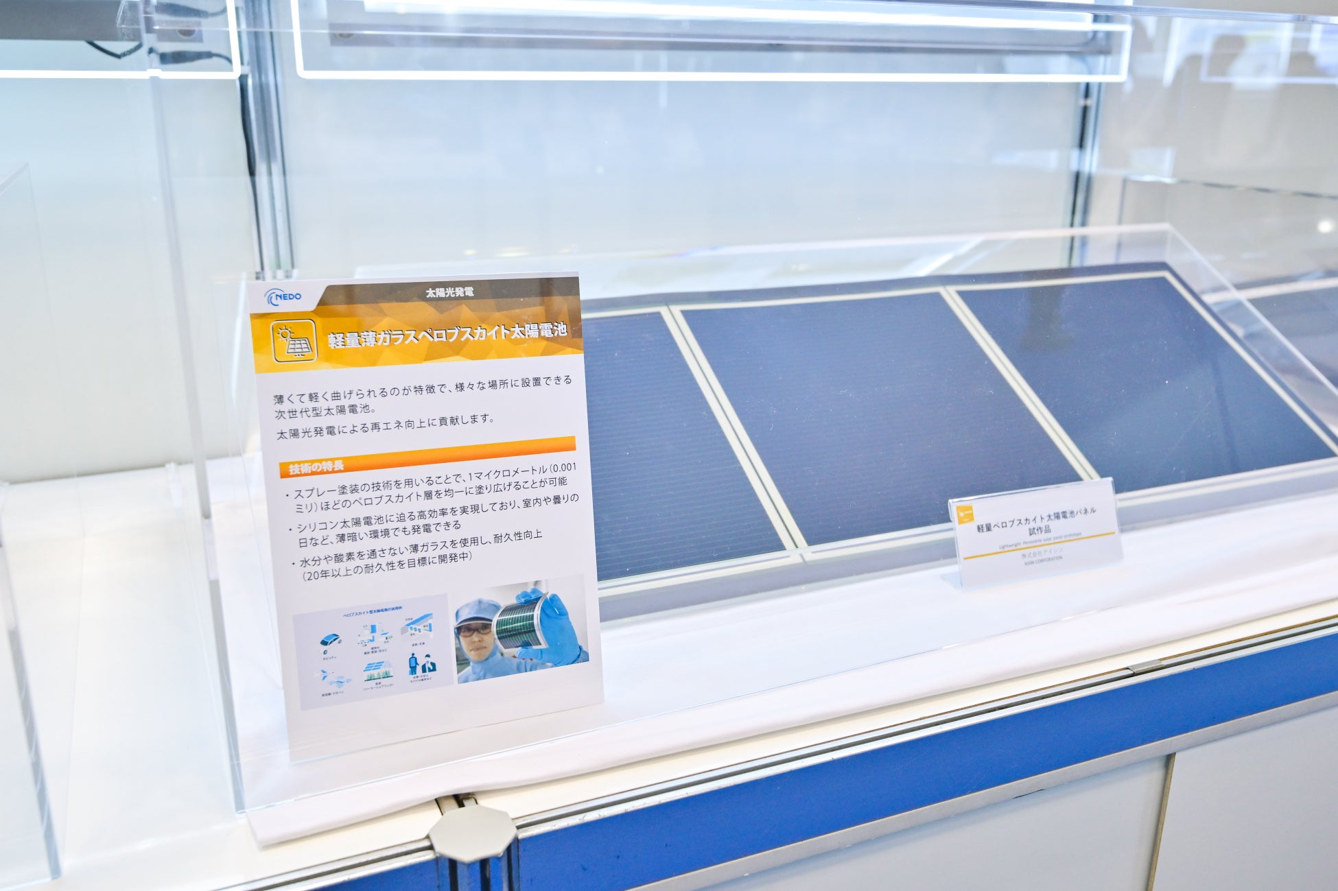 これまで太陽光発電の導入が難しかった場所に設置可能な次世代太陽光電池の開発について、軽量薄ガラスやフィルムなど、様々な素材・形状の展示物を用いてご紹介しました。