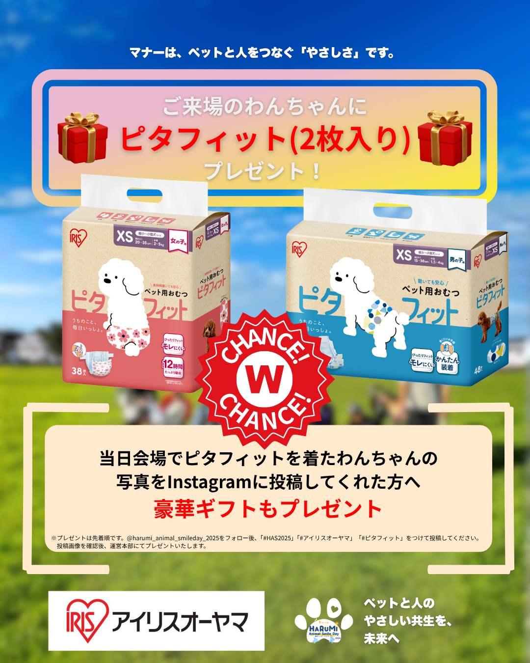 ※@harumi_animal_smile_day_2025のフォロー+「#HAS2025」「#アイリスオーヤマ」「#ピタフィット」をつけて投稿