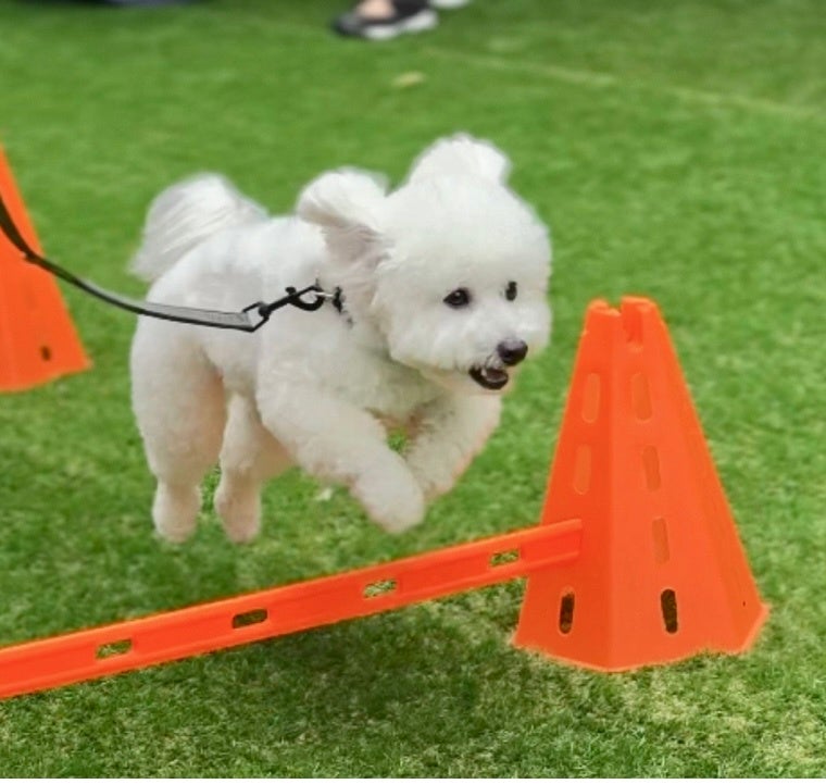 ミニアジリティとは、わんちゃんと飼い主さんが一緒に行う障害物競走のこと。ハードルを飛び越えたり、くねくねとスラロームを歩いたり、