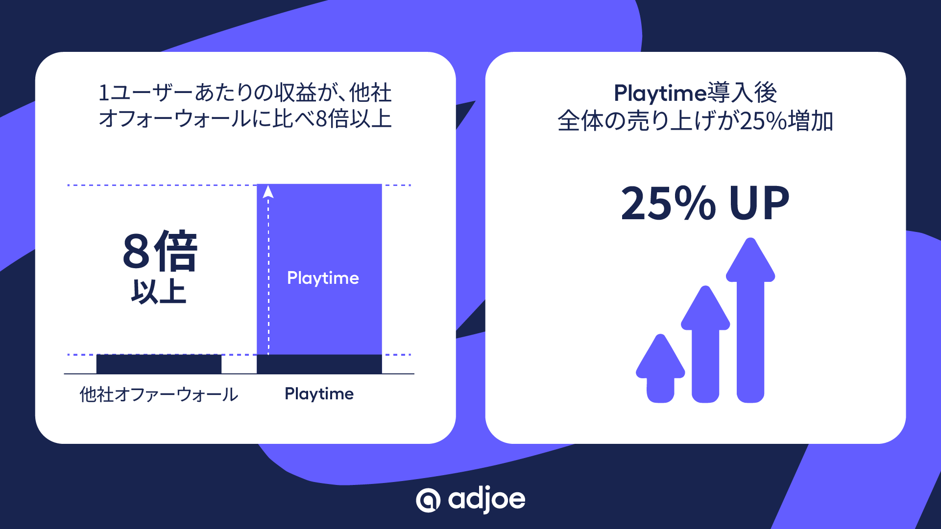 導入直後の全体売上は、実装前と比較して25%増加。その後、還元率アップ施策やマーケティングを強化し、ARPDAU(Playtimeに訪れたユーザー1人あたりの1日平均収益)は27%増、ゲームインストール率は38%増に繋がりました。また、先に利用していた他社のオファーウォールと比較して、PlaytimeのARPDAUは約8.6倍という高い収益効率を達成しました。