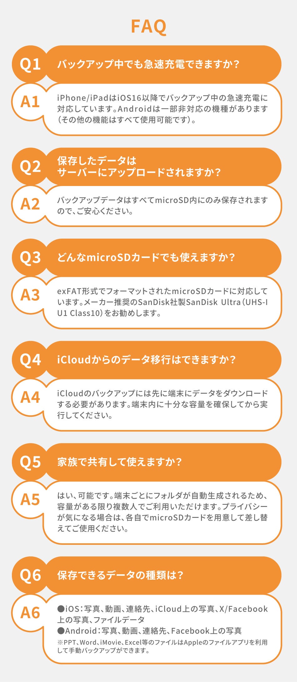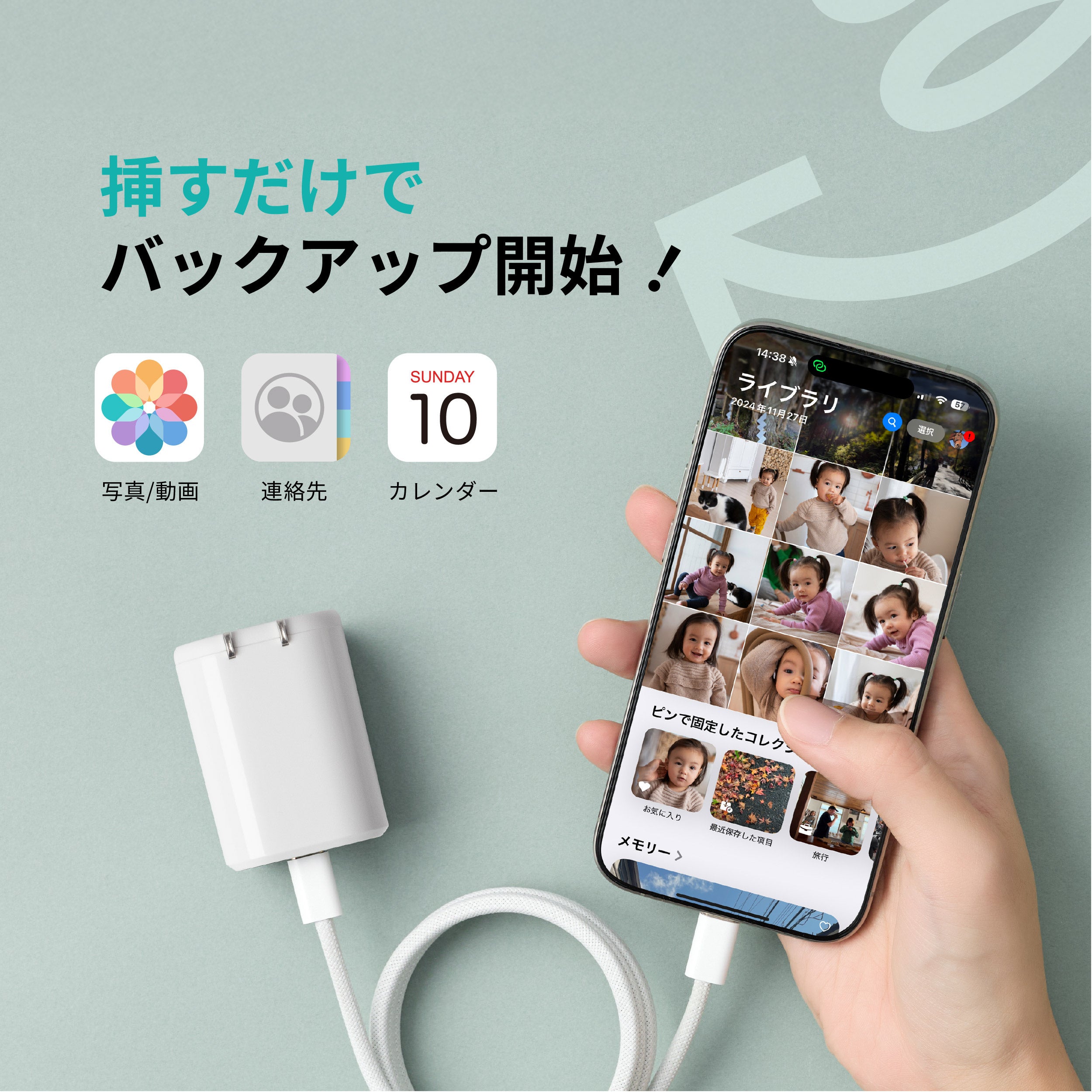 ② 自動バックアップ&データ整理 専用アプリと連携することで、充電のたびに前回の続きから自動バックアップを再開。完了後は年・月別フォルダに自動整理されるため、後から写真を探す手間もかかりません。iOS・Androidの両方に対応しており、ご家族での共用も可能です。