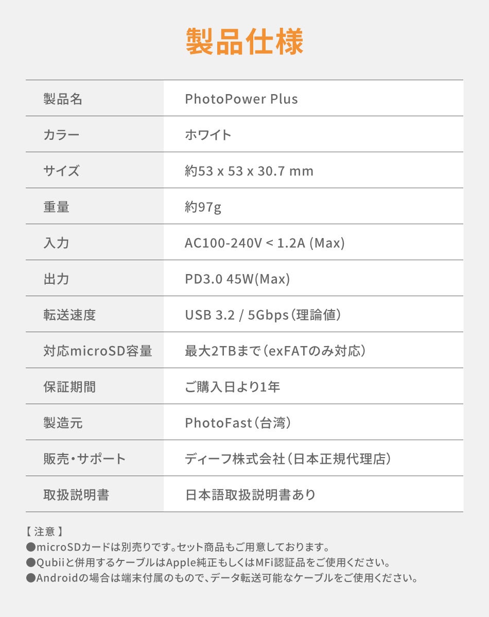 PhotoPower Plusは、こうした課題を解決するために開発された製品です。コンセントに差し込むだけで充電を開始しながら、スマートフォンの写真・動画を自動でmicroSDカードにバックアップします。専用アプリ「PhotoFast ONE」の初回設定後は操作不要。月額費用なし、インターネット接続なしで、大切な思い出をお手元に保存し続けることができます。