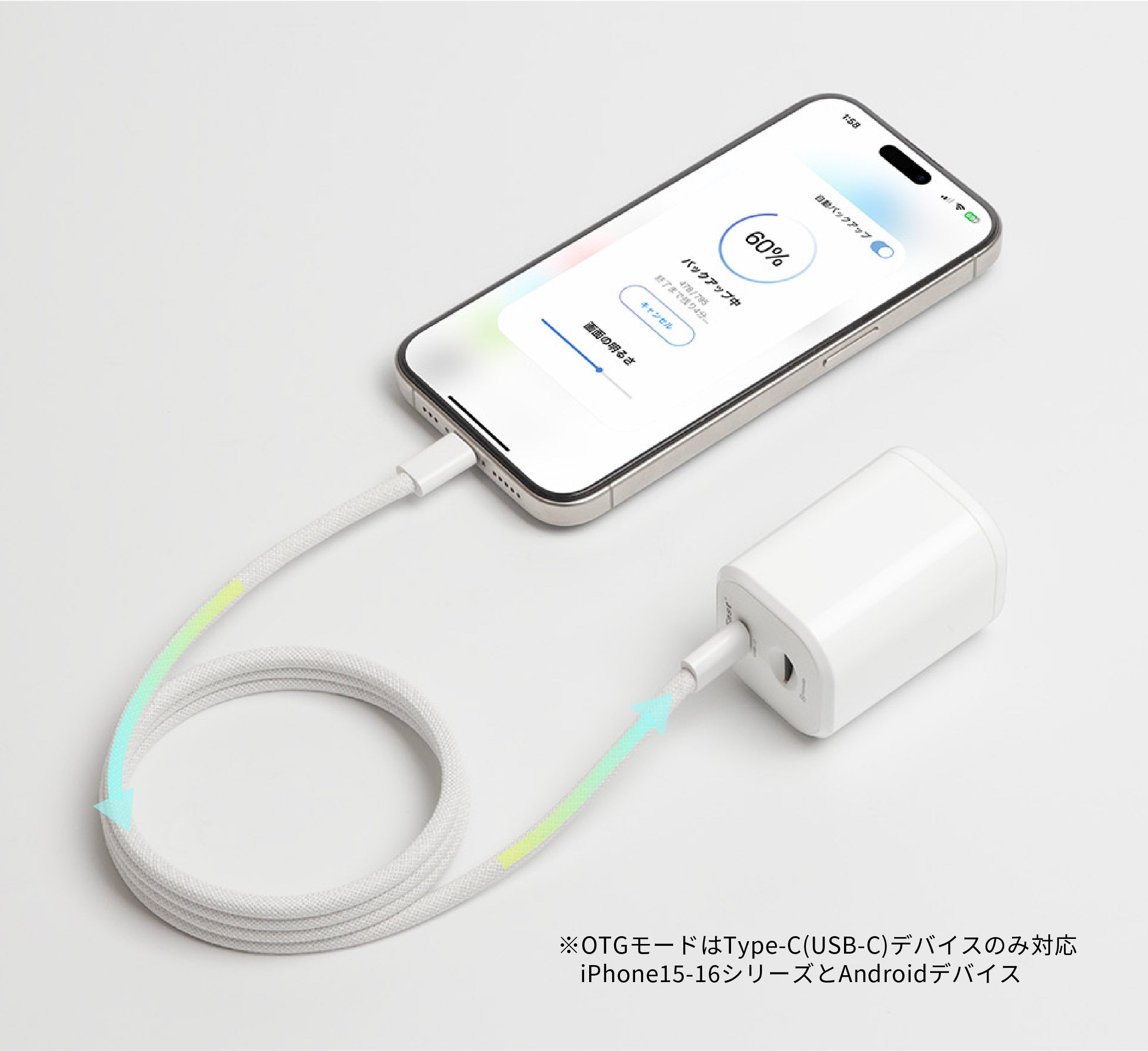 急速充電はバッテリーへの負荷が高く、長期的な劣化につながる場合があります。PhotoPower Plusに搭載された「EcoCharge(低電圧充電)」モードを選択することで、充電中の発熱を抑え、バッテリーへの負荷を軽減します。毎晩充電しながらバックアップするという使い方に最適な設計です。