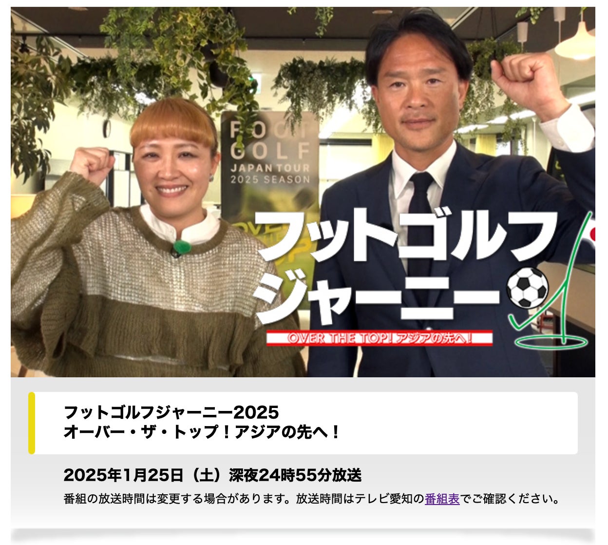 2024年9月にマレーシアで開催されたフットゴルフアジアカップに挑んだ日本代表に独占密着した模様を放送予定。また番組を通じて、日本フットゴルフ界の現状をお届けする他、愛知県初となることで注目を集める常設フットゴルフ場を紹介いたします。また、ナビゲーターは元なでしこジャパンの丸山桂里奈さんが務めます。