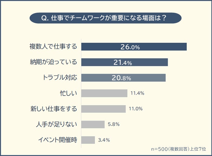 「仕事のチームワークが重要になる場面」として最も多かった回答は「複数人で仕事するとき(26.0%)」でした。2位は「納期が迫っている(21.4%)」、3位「トラブル対応(20.8%)」が続きます。