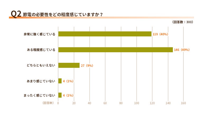 反対に、「あまり感じていない」や「まったく感じていない」と回答した人はそれぞれ1%と、非常に低い割合になりました。「どちらともいえない」と回答した人も9%にとどまり、全体的に見てもほとんどの人が節電の必要性を感じているといえるでしょう。