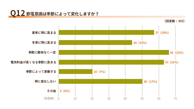 この質問の回答からは、季節によって節電意識が変わる人が多いことがわかりました。「夏季に特に高まる」(19%)、「冬季に特に高まる」(15%)、「季節によって変動する」(7%)を合わせた4割以上の人が、季節に応じて節電意識が変化すると回答しています。