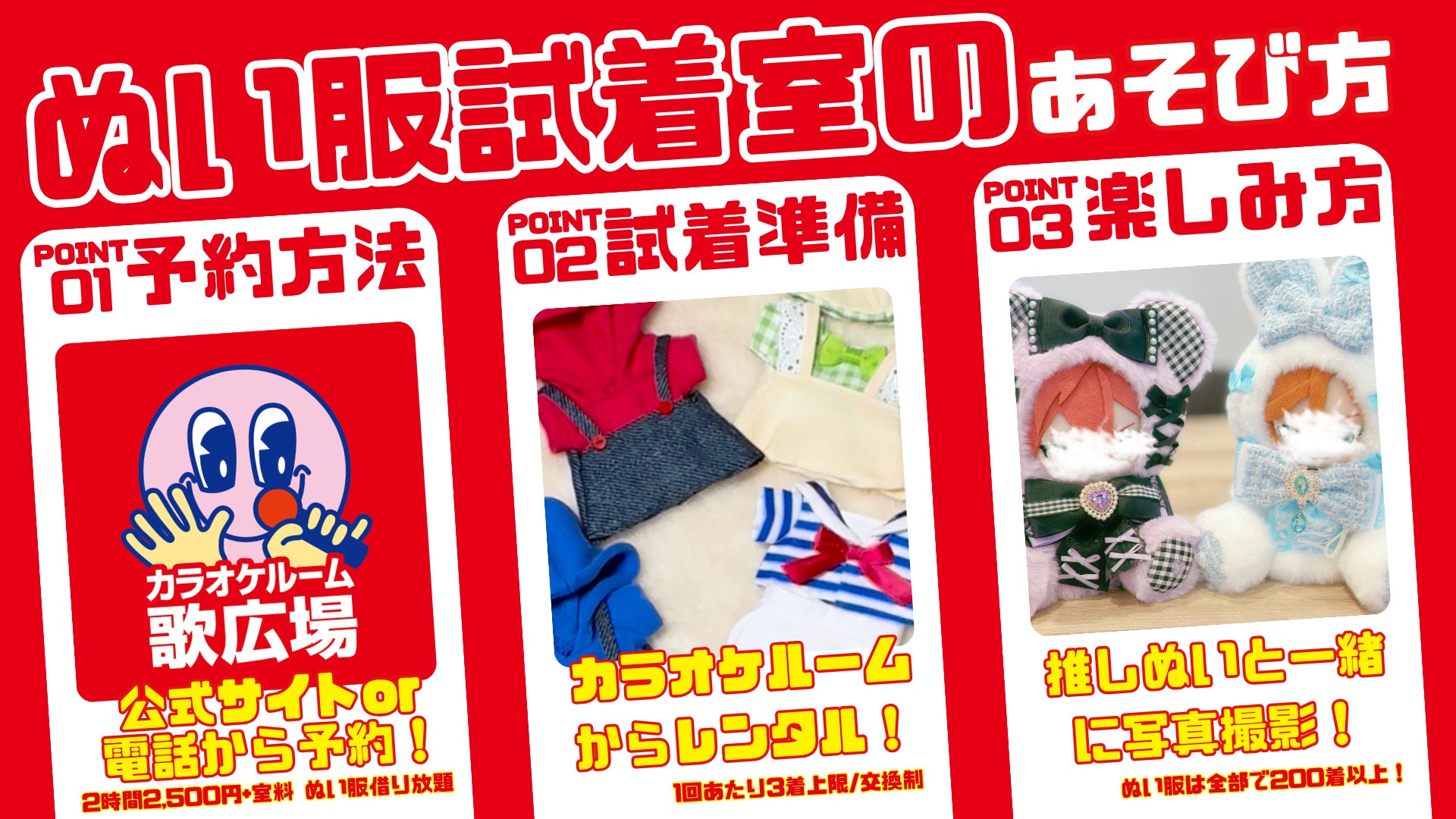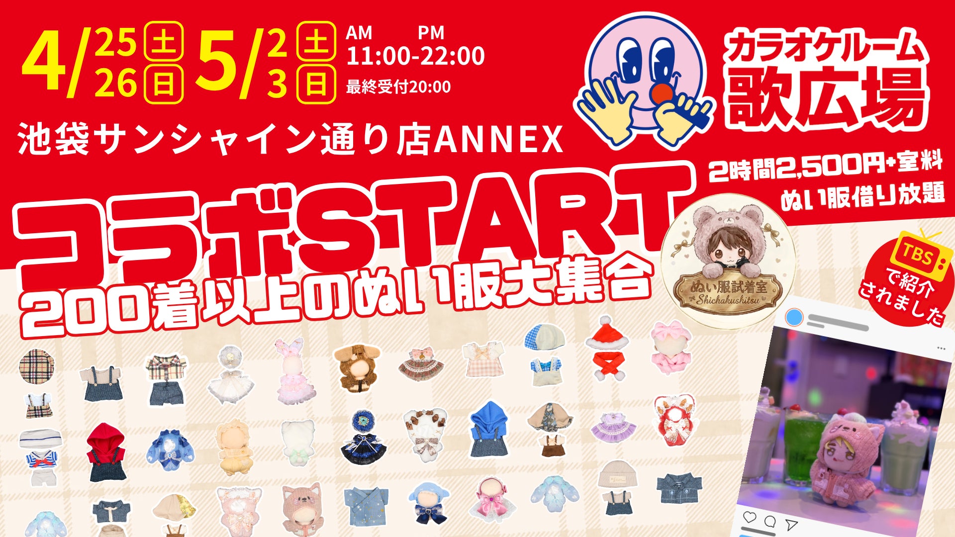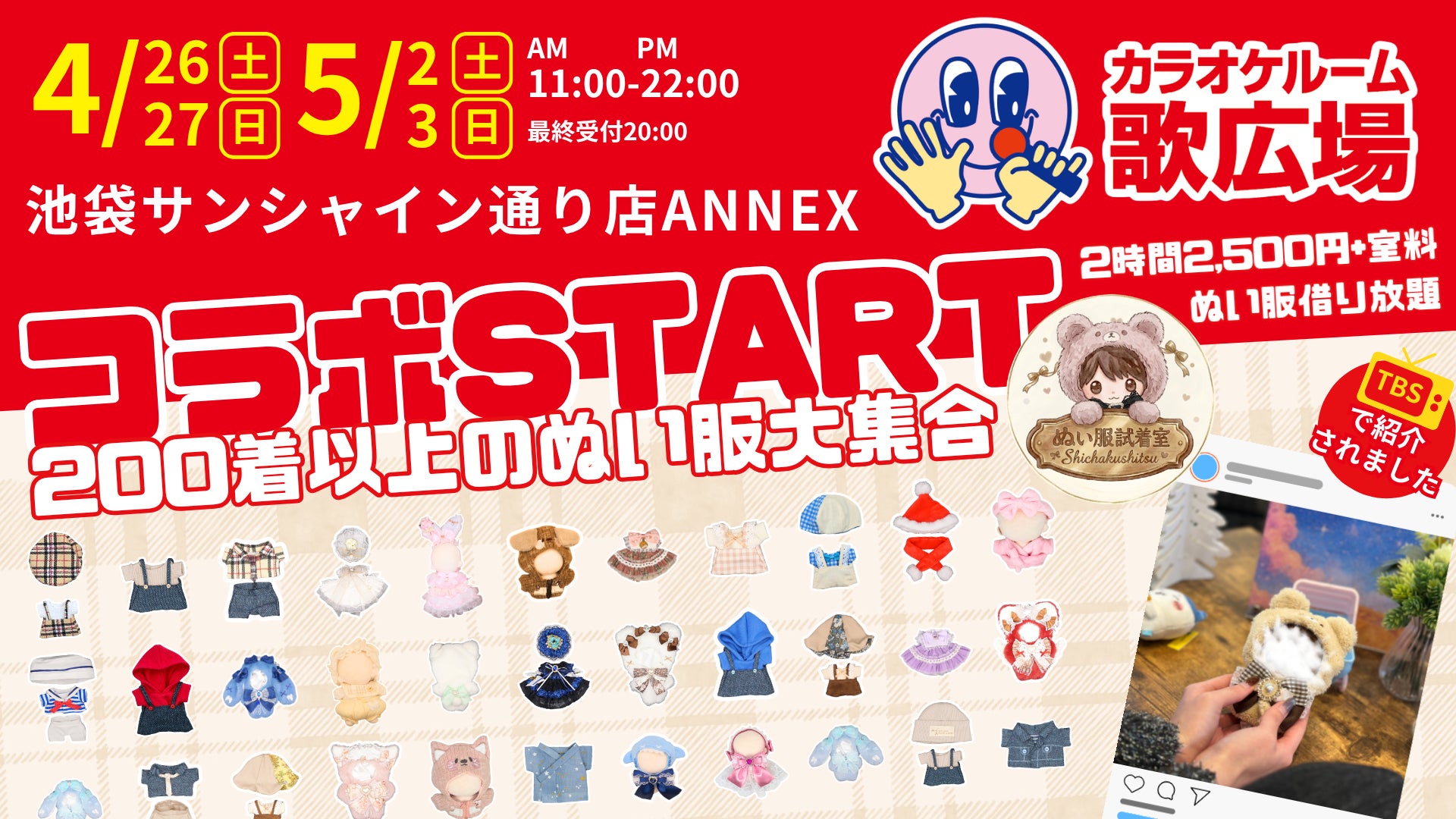 2026年4月25日(土)・26日(日)、5月2日(土)・3日(日)の4日間限定で、歌広場「池袋サンシャイン通り店ANNEX」にて「ぬい服試着室」を開催いたします。