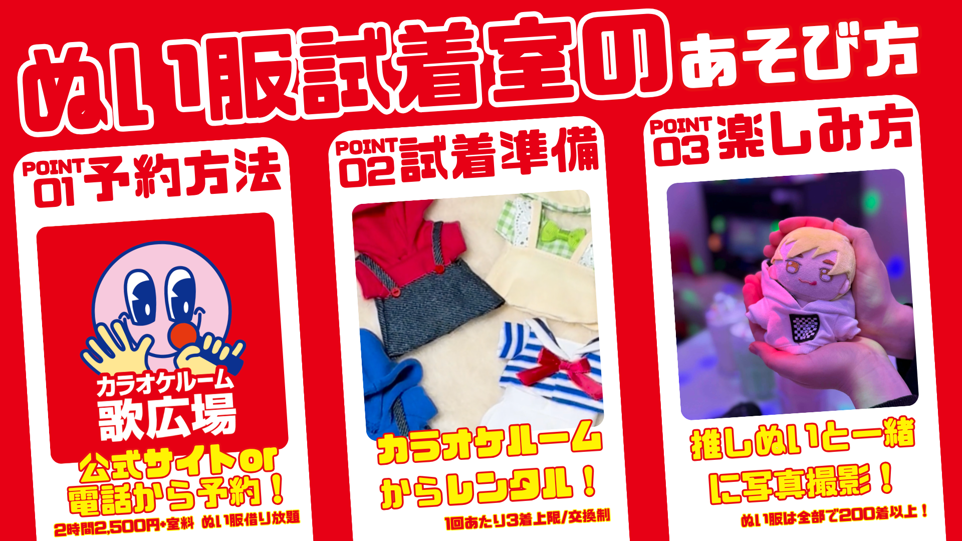 これまで「ぬい服試着室」は池袋で定期イベントとして開催してまいりました。今後はその枠を広げ、私たちからお客様のもとへ「ぬい服試着室」をお届けしていきます。カフェやカラオケ、さまざまな空間と掛け合わせることで、より日常の中に溶け込む「推し活体験」を目指し、特別なイベントとしてだけでなく、普段の推し活の延長線上で、気軽に楽しめる場を創出してまいります。