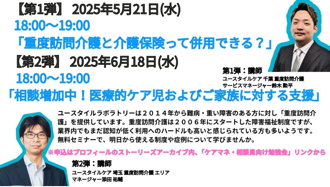 「すべての必要な人に、必要なケアを届ける。」をミッションに、重度訪問介護事業を中心とした包括的介護福祉サービスを全国に届けるユースタイルラボラトリー株式会社(本社:東京都中野区、代表取締役:大畑健)は、2025年5月より「ユースタイルケア重度訪問介護セミナー」を毎月1回オンラインにて無料開催します。