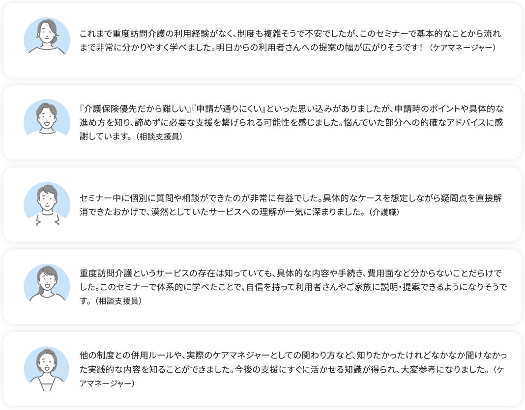 これまでも、全国各地の事業所単位で「ユースタイルケア重度訪問介護セミナー」を不定期開催してきました。参加者の皆さんからいただいた声をご紹介します。