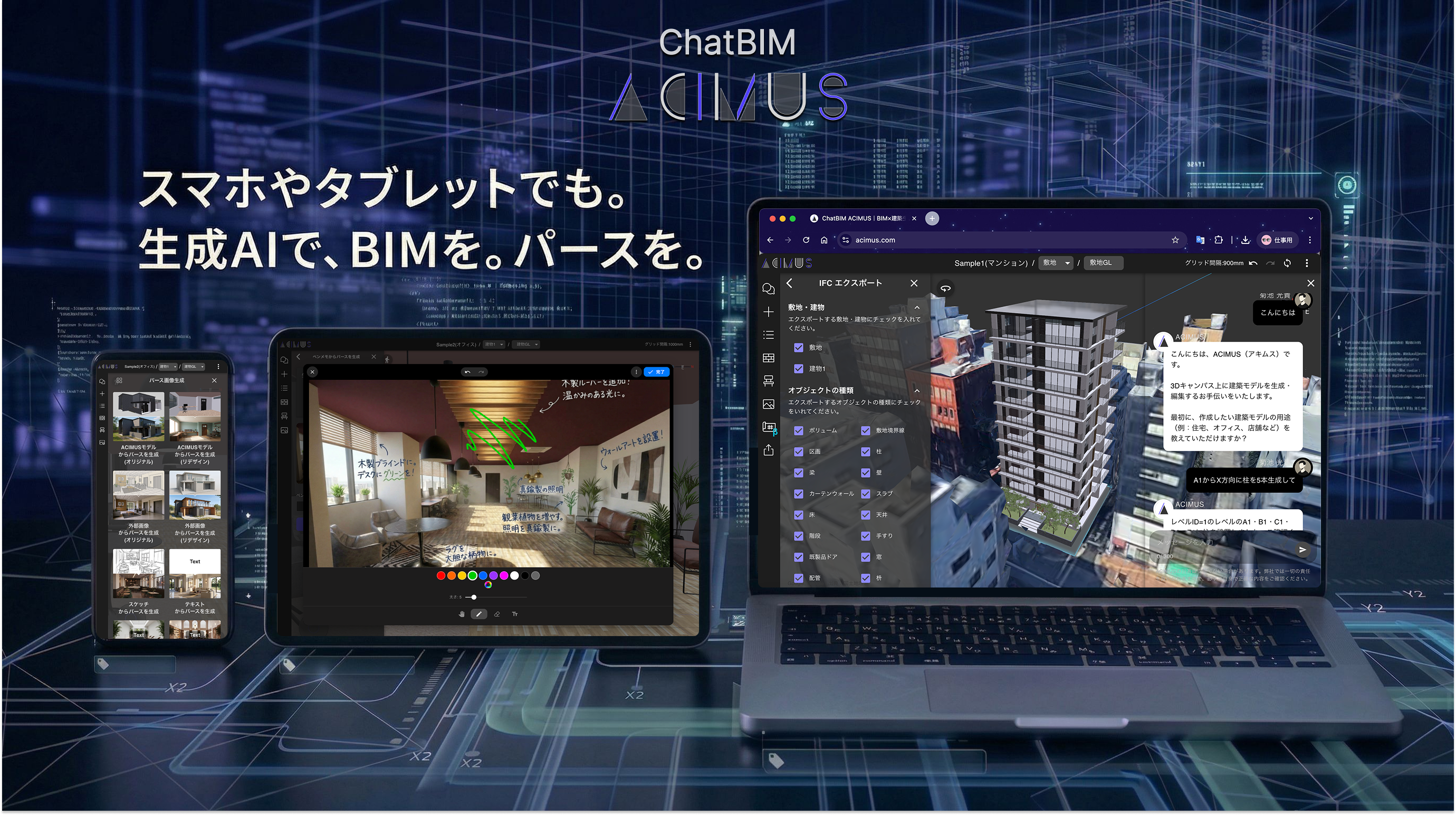 【モバイルBIM】建設DXを支援するChatBIM「ACIMUS」がモバイル対応。スマホでも生成AIと対話しながらBIMモデルの作成や編集はもちろん、建築パースの生成まで商談や打合せでも活用可能に