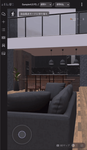 画面上に表示されるバーチャルジョイスティックで、建物内を自由に歩き回る一人称視点の体験が可能です。施主やクライアントへの空間提案を、その場でスマートフォンやタブレットから行えます。