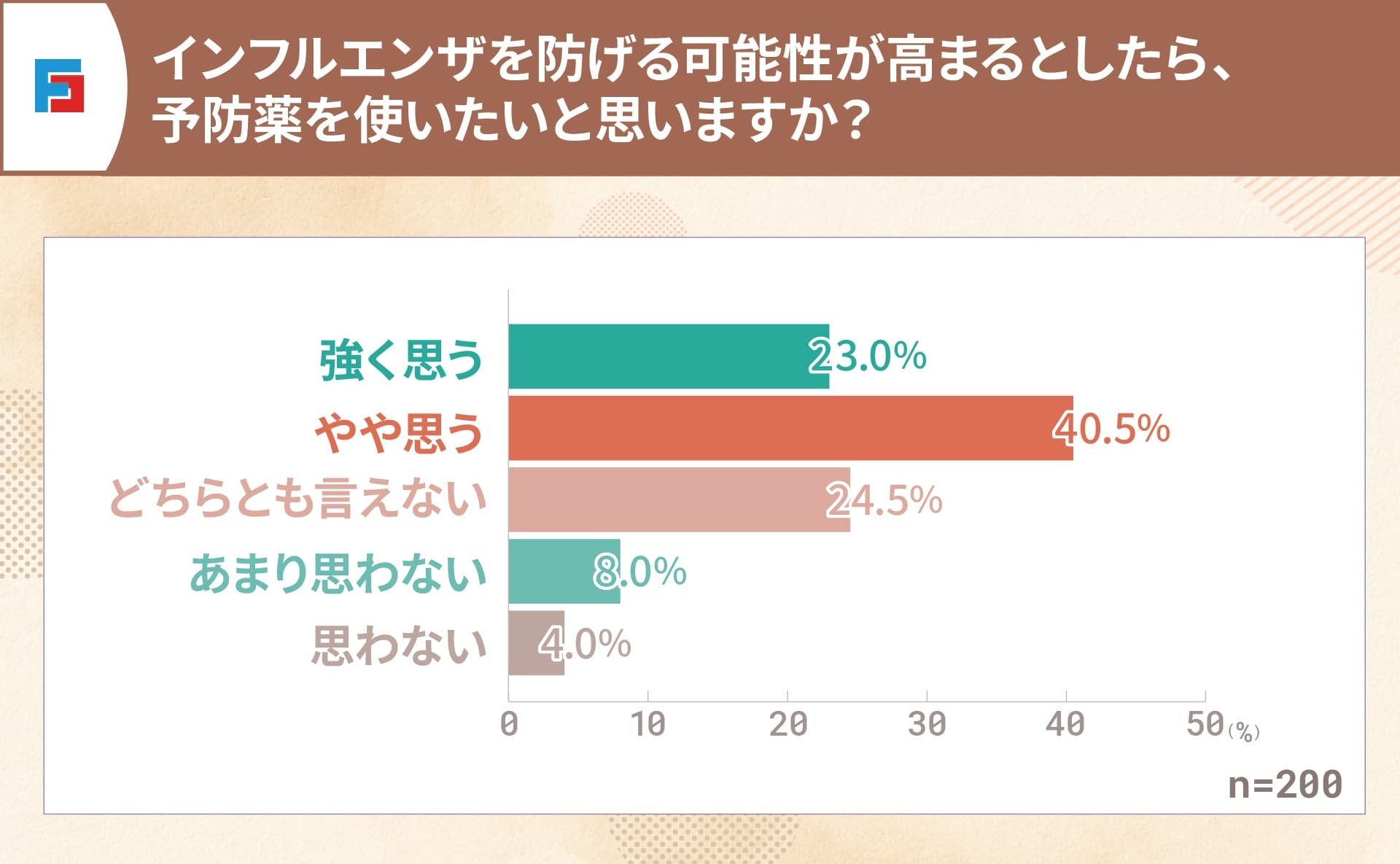 インフルエンザを防げる可能性が高まるとしたら、予防薬を使いたいと思うか聞いたところ、「強く思う(23.0%)」「やや思う(40.5%)」を合わせて63.5%が『使いたい』と前向きな意向を示す結果となりました。