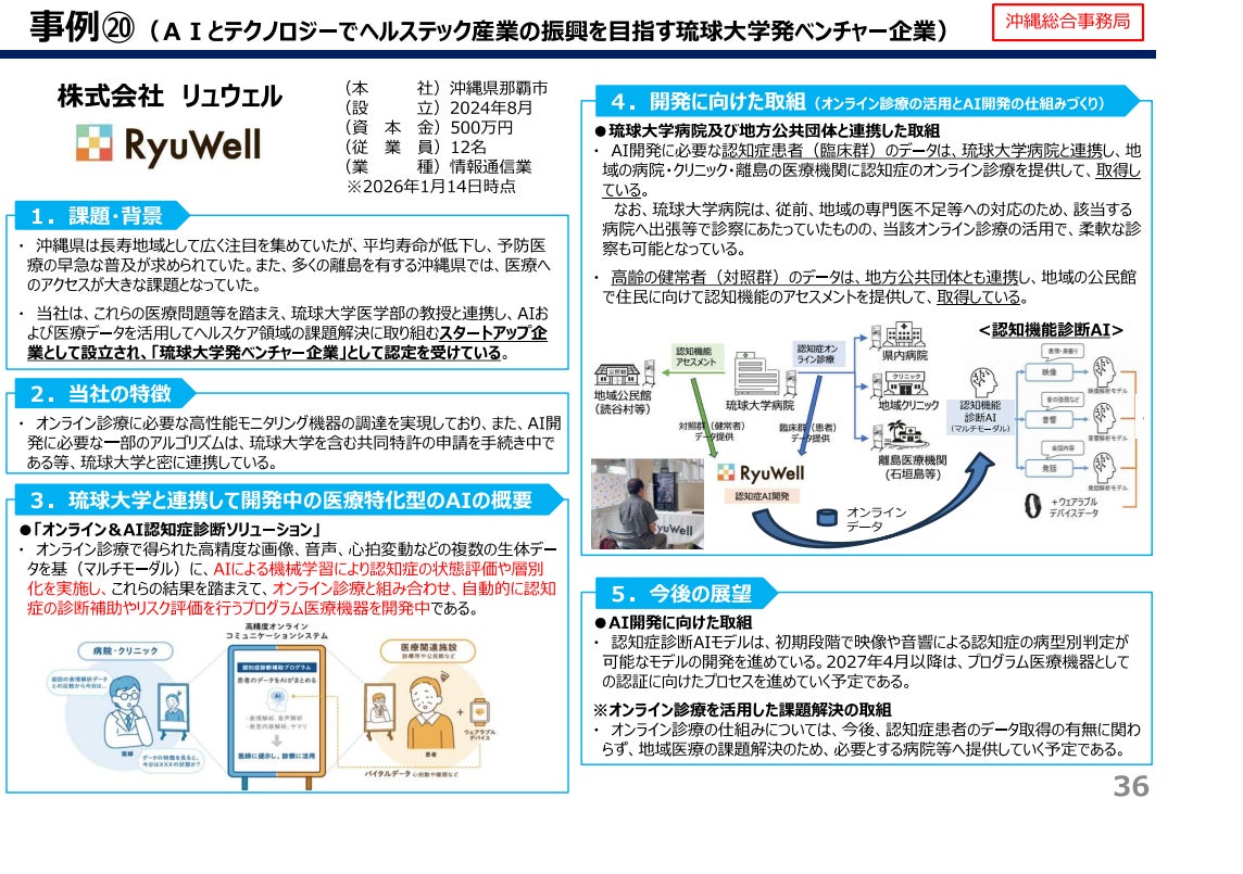 沖縄総合事務局の席上配付資料において、「地域におけるAI活用の現状(事例紹介)」の枠組みで株式会社リュウェルが掲載されました。オンライン診療 × マルチモーダルAIによる認知症領域の取り組み、琉球大学病院・自治体と連携したデータ取得体制、および社会実装モデルと今後の見通し(SaMD認証を見据えた開発プロセス)が図解付きで紹介されています。