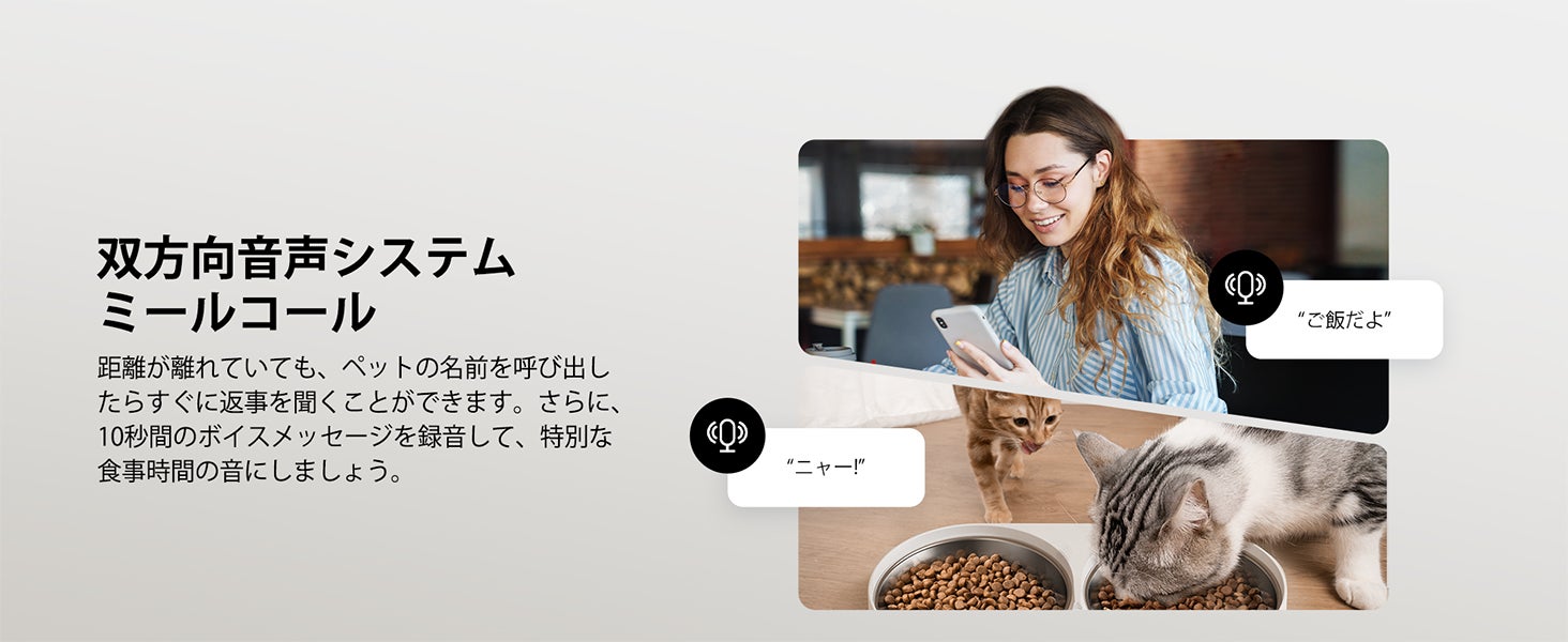 これにより、食事の時間にペットとの親密さを保つことができます。ペットは規則正しい生活を好むため、食事の呼びかけが非常に重要です。双方向音声システムにより、声でペットを慰めたり、彼らの楽しい吠え声やニャー音を聞いたりすることができます。