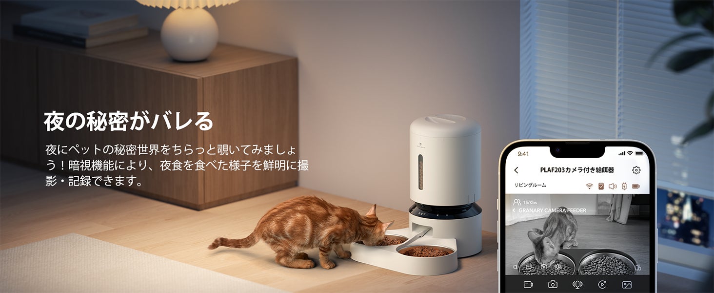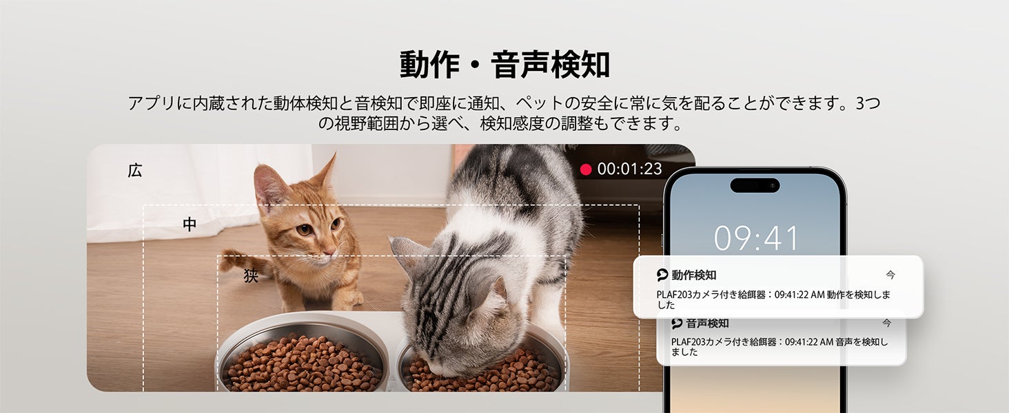 動き検知センサーが動きを感知すると、カメラはペットの活動を記録し、動画を保存します。スマートフォンに通知が届き、リアルタイムで視聴することができます。使いやすいPETLIBROアプリを通じて、いつでもどこでも食事の量、食事内容、給餌時間を計画できます。