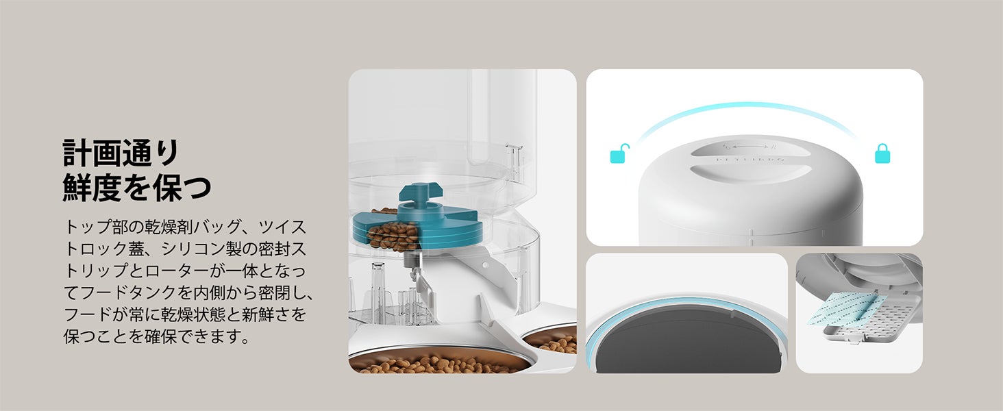 タンクの底にある特許取得済みのローターとスナップロック蓋が、ペットが給餌器に侵入して余分な食べ物を取るのを防ぎます。付属の乾燥剤袋とシーリングストリップが食べ物を新鮮でカリカリに保ちます。