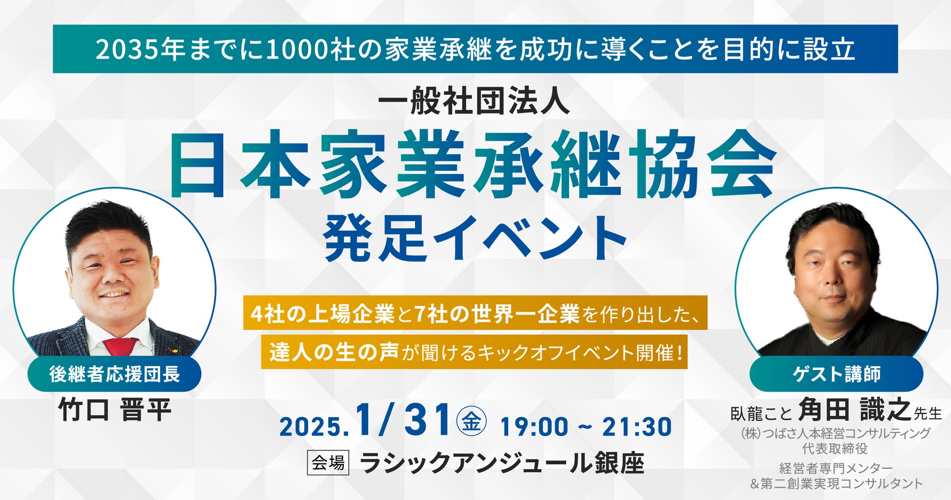 2024年12月に設立予定の日本家業承継協会の活動の一環として、2025年1月には発足イベントが開催されます。このイベントでは、臥龍・角田識之先生を迎えた特別講演も予定されており、家業承継に関心を持つ多くの方々にとって有益な場となることでしょう。
