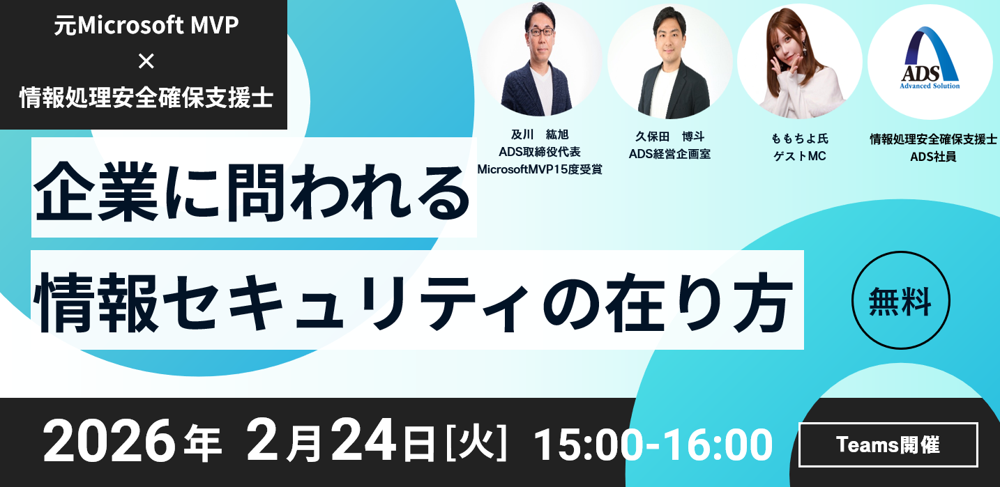 アドバンスド・ソリューション株式会社(本社:東京都中央区、代表取締役:及川紘旭、以下ADS)は、2026年2月24日16時より、Microsoft領域の専門家による情報セキュリティ無料オンラインセミナーを開催します。Microsoft MVP15回の受賞歴を誇る代表及川と、情報処理安全確保支援士を保有するADS部門長が登壇し、企業に求められる最新の実務型セキュリティ対策を解説します。