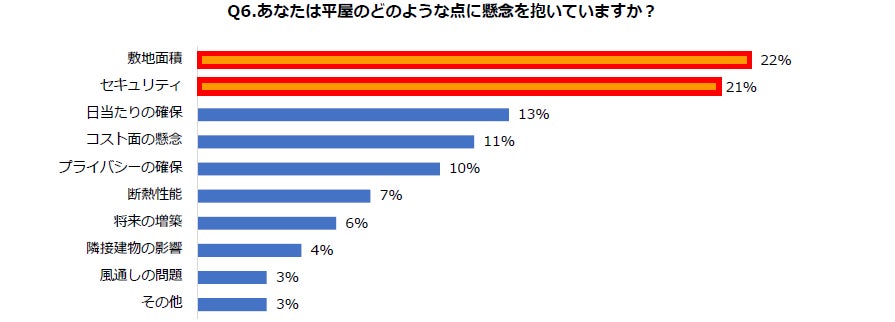平屋を検討する際の懸念点は「敷地面積」と「セキュリティ」が約2割でトップ