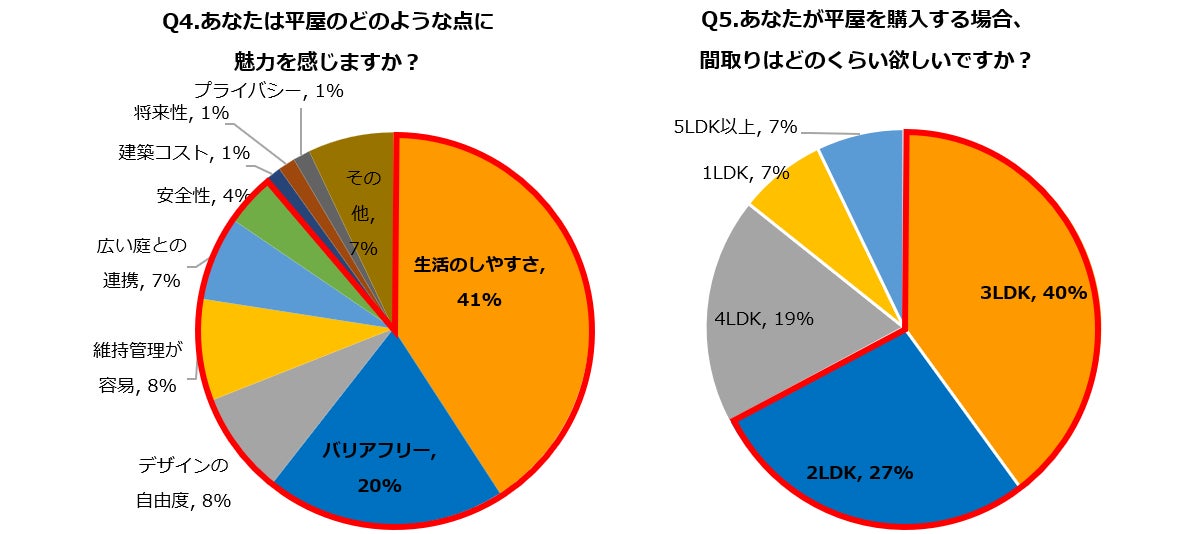 平屋の魅力は「生活のしやすさ」が4割で最も高く、続いて「バリアフリー」が2割