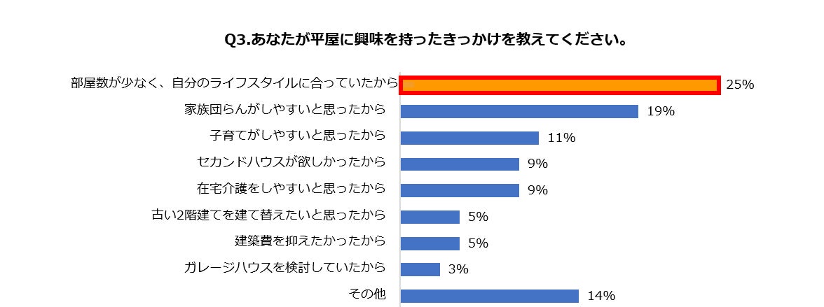 平屋に興味を持ったきっかけは「部屋数が少なく、自分のライフスタイルに合っていたから」、「家族団らんがしやすいと思ったから」、「子育てがしやすいと思ったから」がTOP3