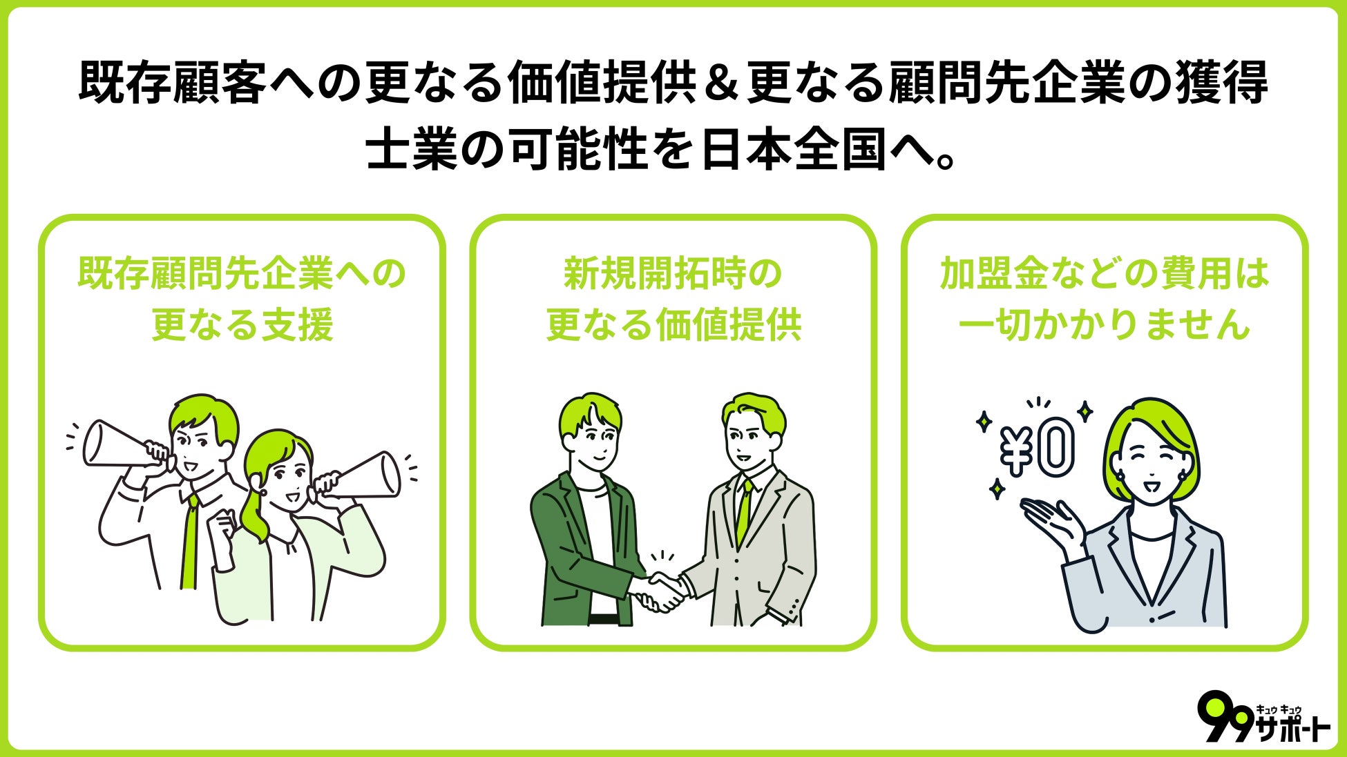 99サポートを活用することで、士業は「こうあるべき」という提案だけでなく、“実際に人が動くところまで支援できるパートナー”として、クライアント企業の経営に深く関わることが可能になります。