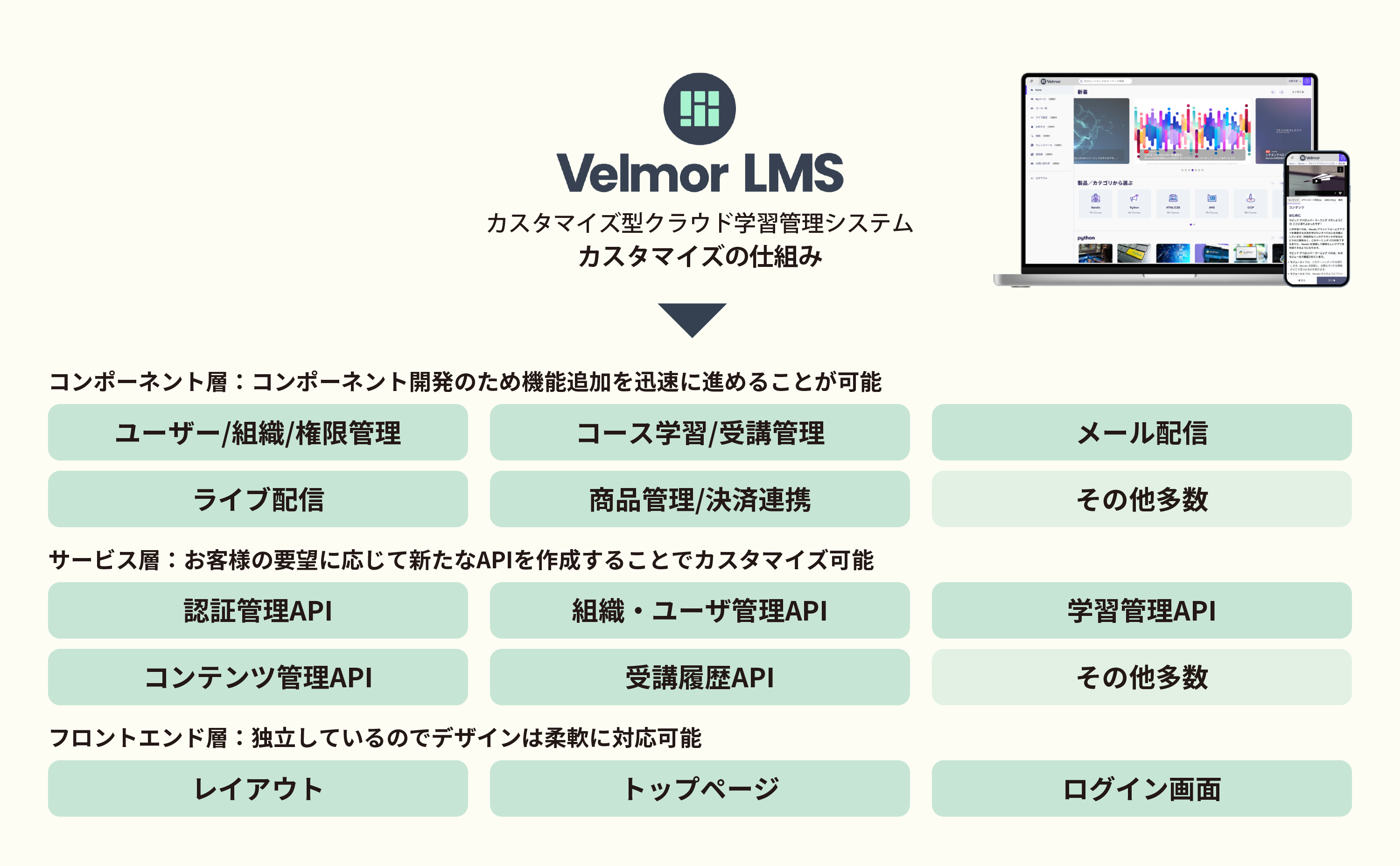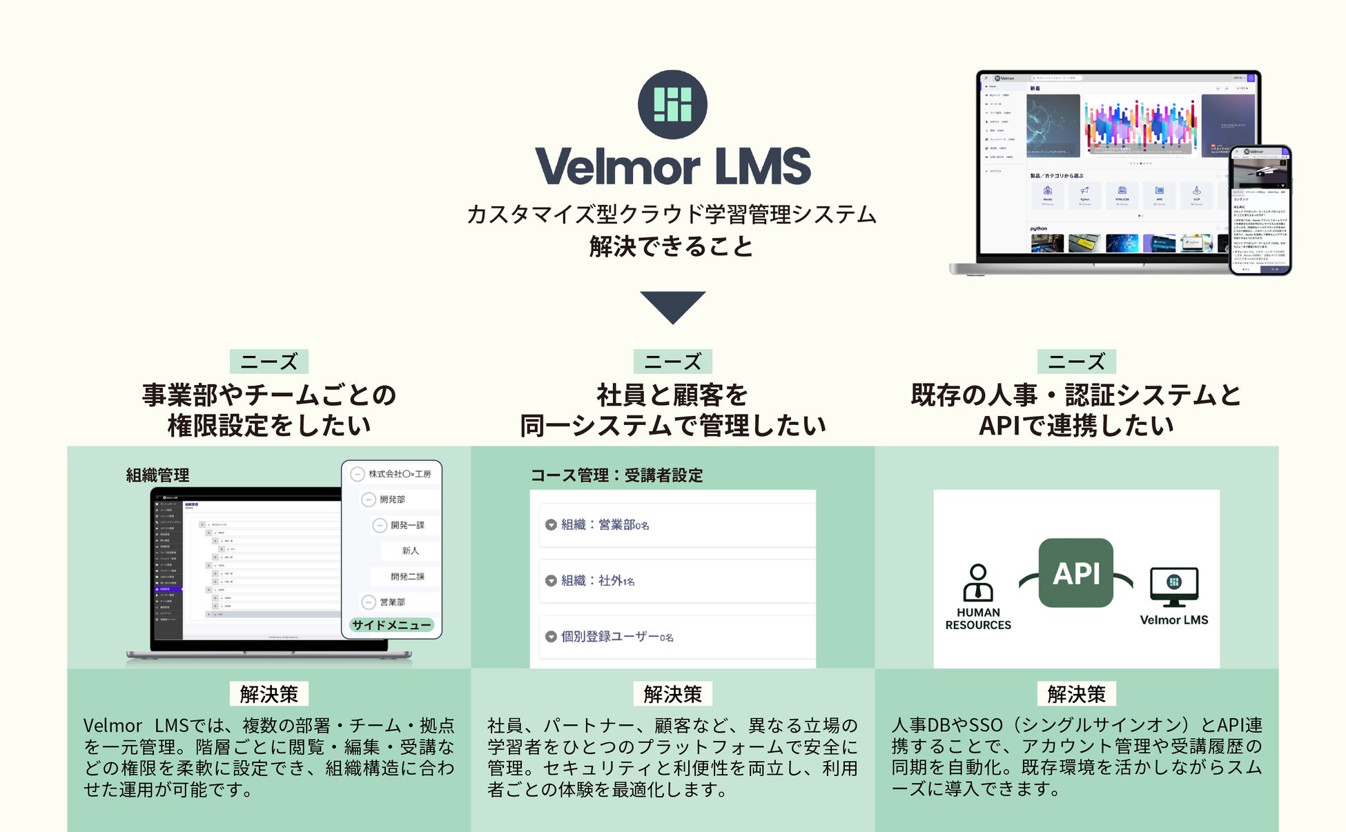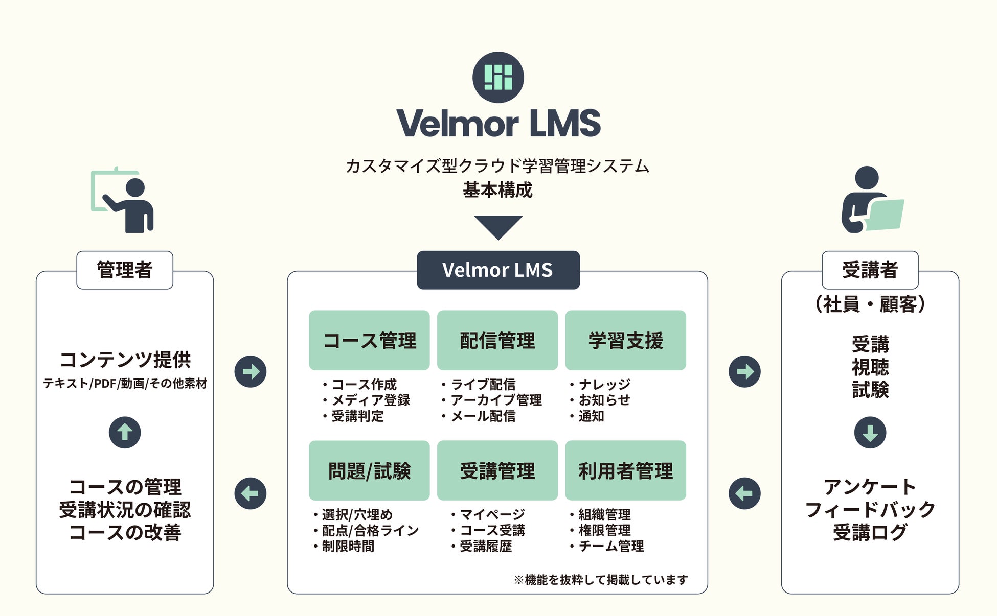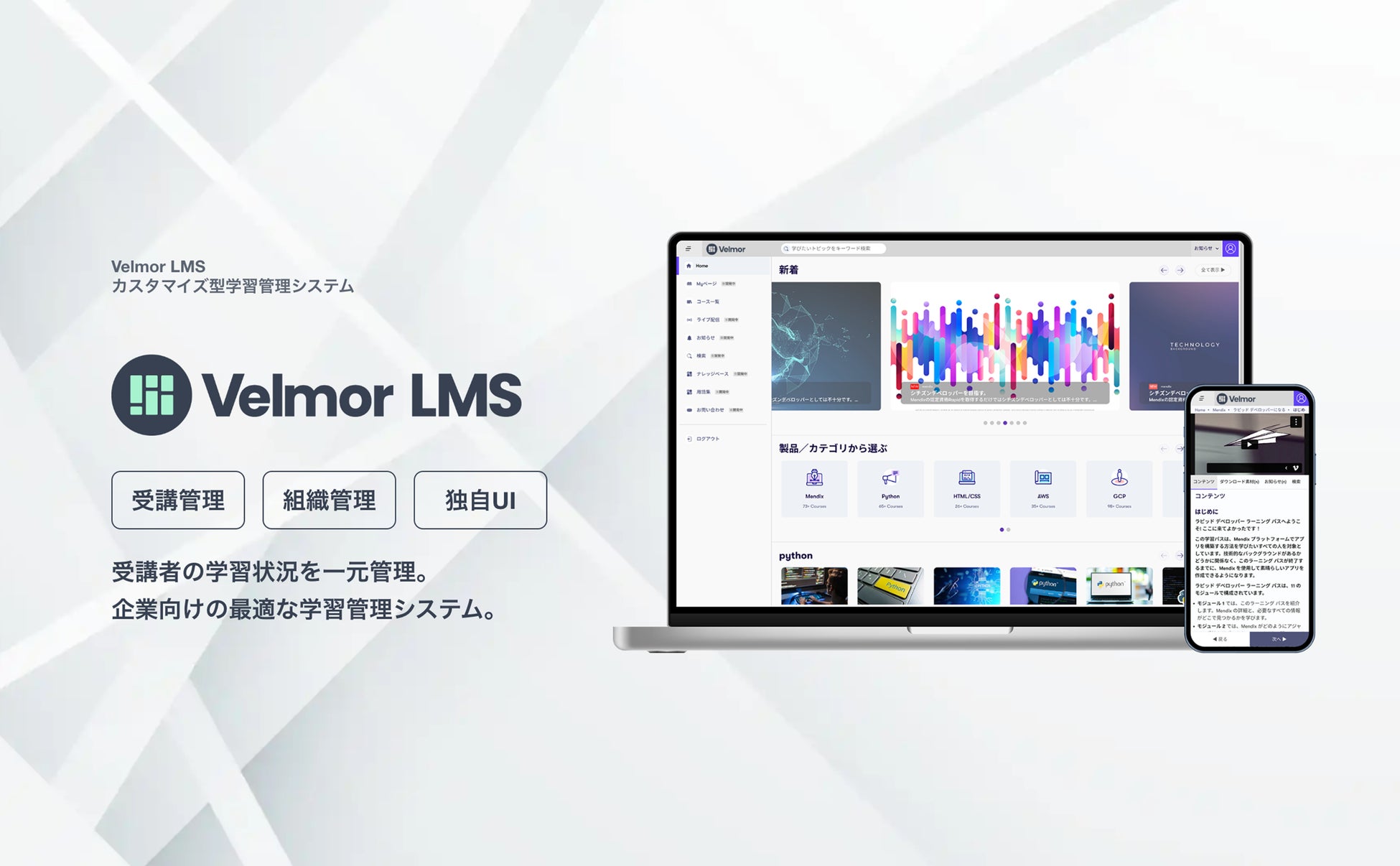 Velmor LMSは、企業や各種組織の研修・教育をオンラインで一元管理するクラウド型LMS(Learning Management System:学習管理システム)です。教材配信や受講管理、理解度測定に加え、企業ごとの柔軟なカスタマイズを特徴とし、eラーニングの効率的な運用を支援します。