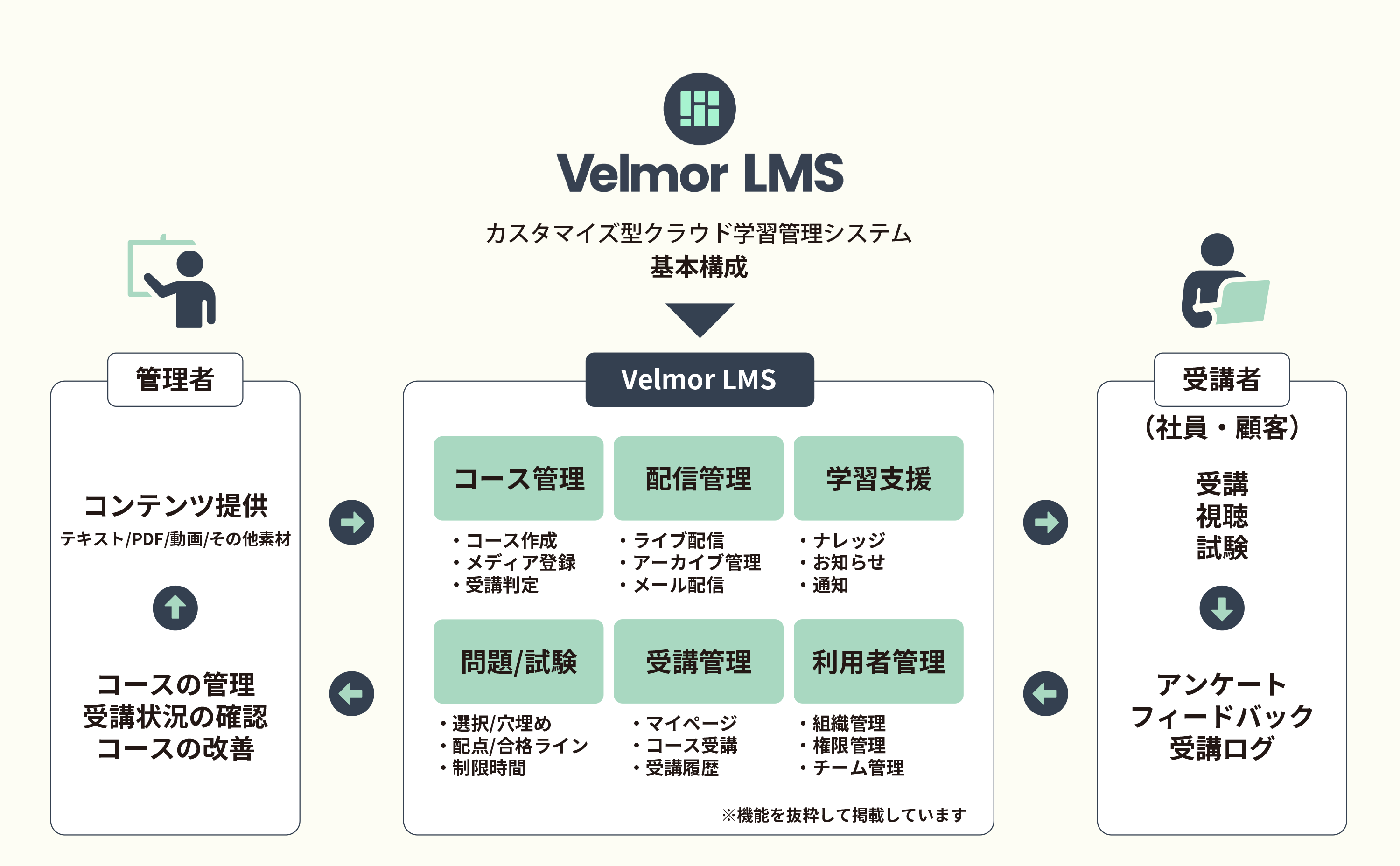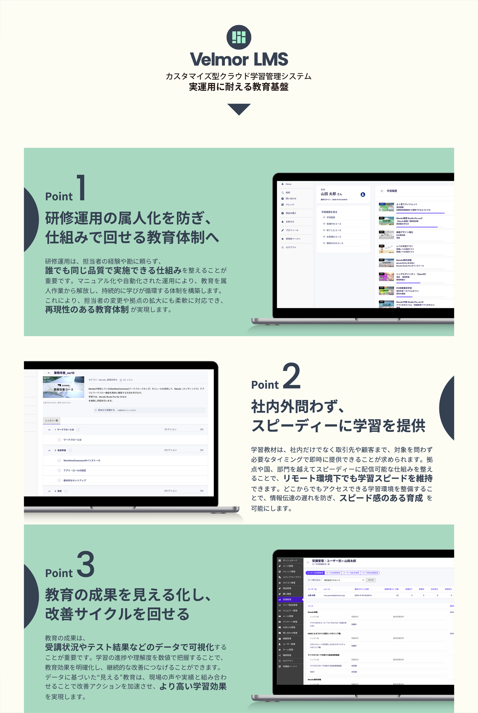 Velmor LMSの導入により、企業においては研修運用の属人化を防ぎ、教育体制をシステムとして提供する体制が整備されます。また、社内外にスピーディーに教育・学習の機会を提供できることに加え、教育・学習の成果を可視化し、さらなる改善に向けて継続的に取り組むことが可能となります。