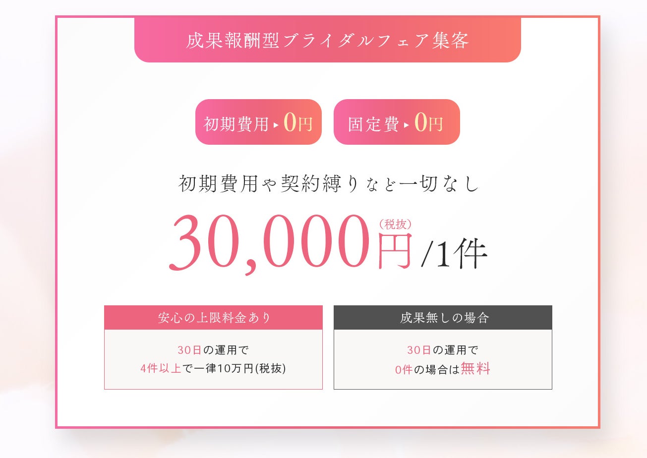 成果報酬型ブライダルフェア集客サービス始動!フェア予約0件の場合は一切費用がかからないブライダル事業者様必見のサービス!