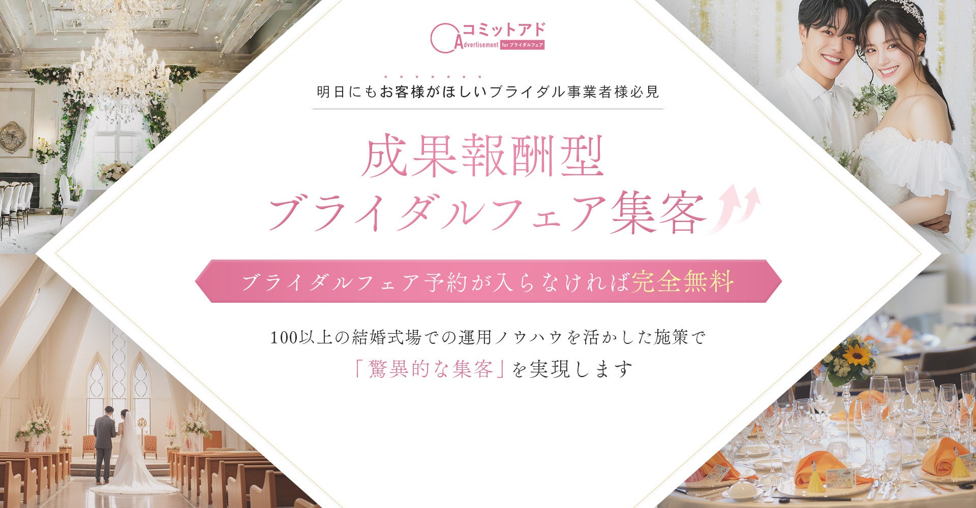 コミットアドforブライダルフェアは、「ブライダルフェア予約が入らなければ完全無料」をお約束する完全成果報酬型の集客サービスです。その他の費用は一切かからないのでご安心ください。ブライダルフェア集客にお悩みの事業者様にとっては、広告費を無駄にするリスク無く、WEB集客が可能なサービスとなっております。