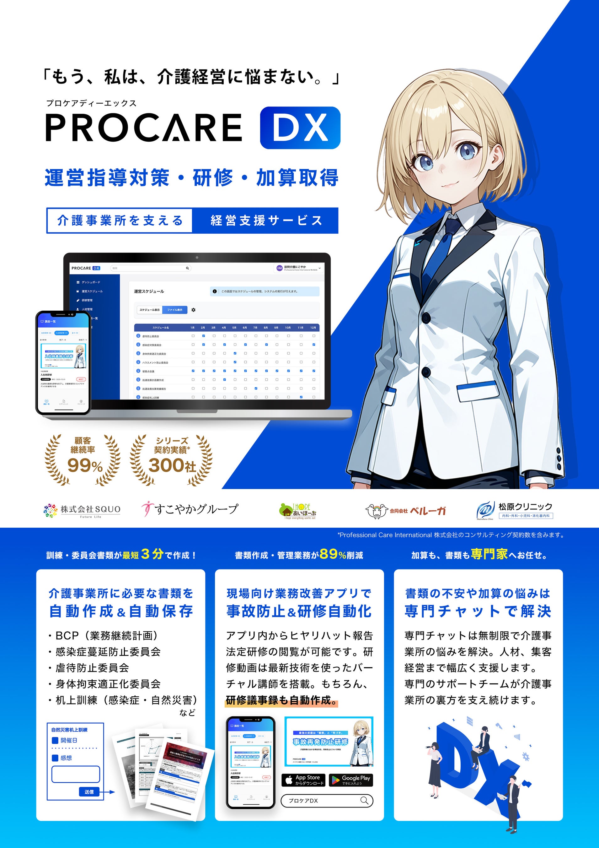 【正式リリース】介護経営に「守り」と「攻め」を!経営支援DXツール「プロケアDX」最新技術を使ったバーチャル講師による研修、運営指導対策、加算取得で介護事業所を支え続けます。