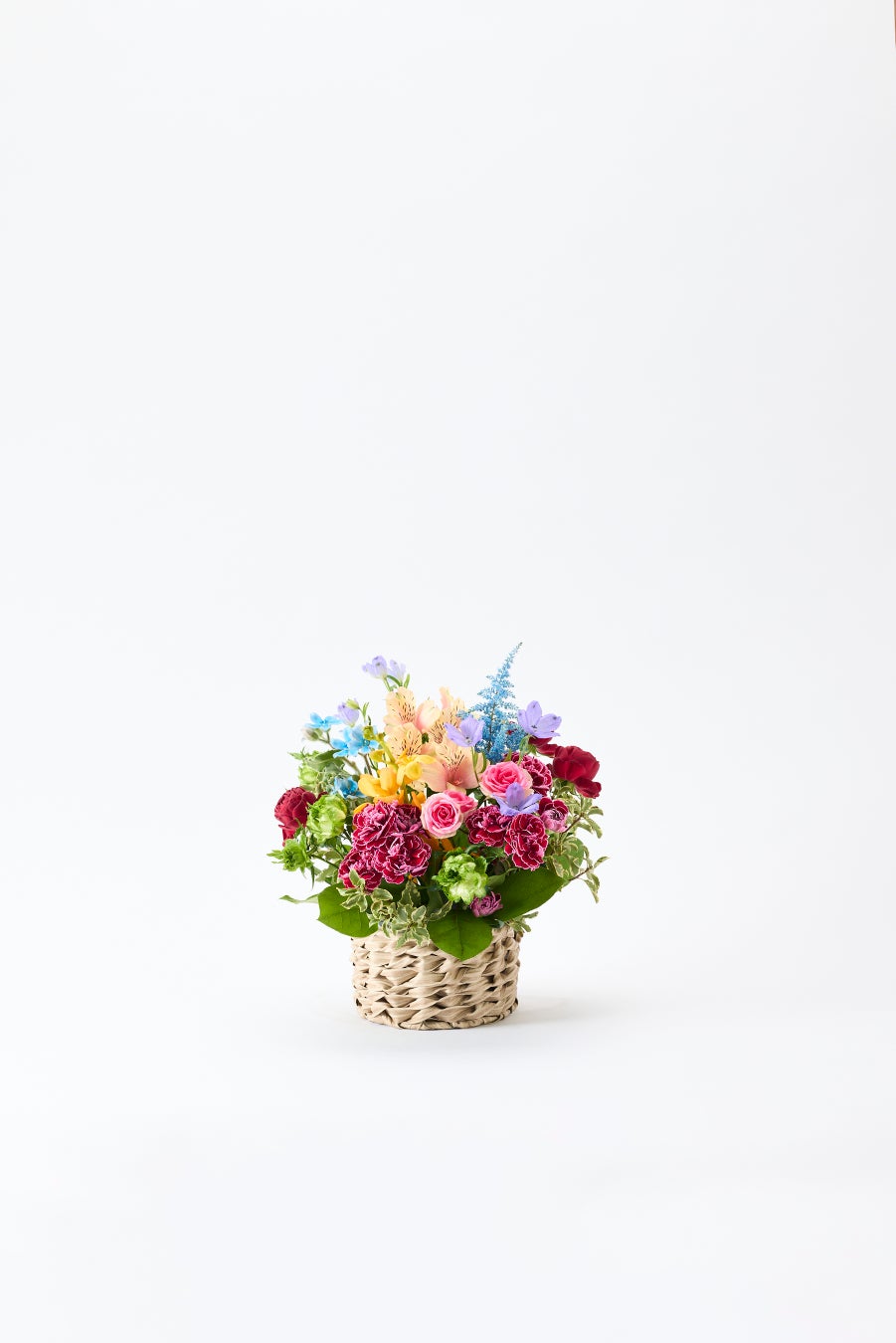 花材:カーネーション(レッド)/スプレーバラ(ピンク・グリーン・レッド)/アルストロメリア(ライトオレンジ)/モカラ(オレンジ)/アスチルベ(ブルー染)/オキシペタルム(ライトブルー)/デルフィニューム(ラベンダー)/グリーン