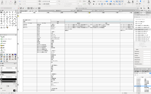 仕上表のマスターシートを起点に、室名・素材・仕上げ等の選択肢を一括管理。