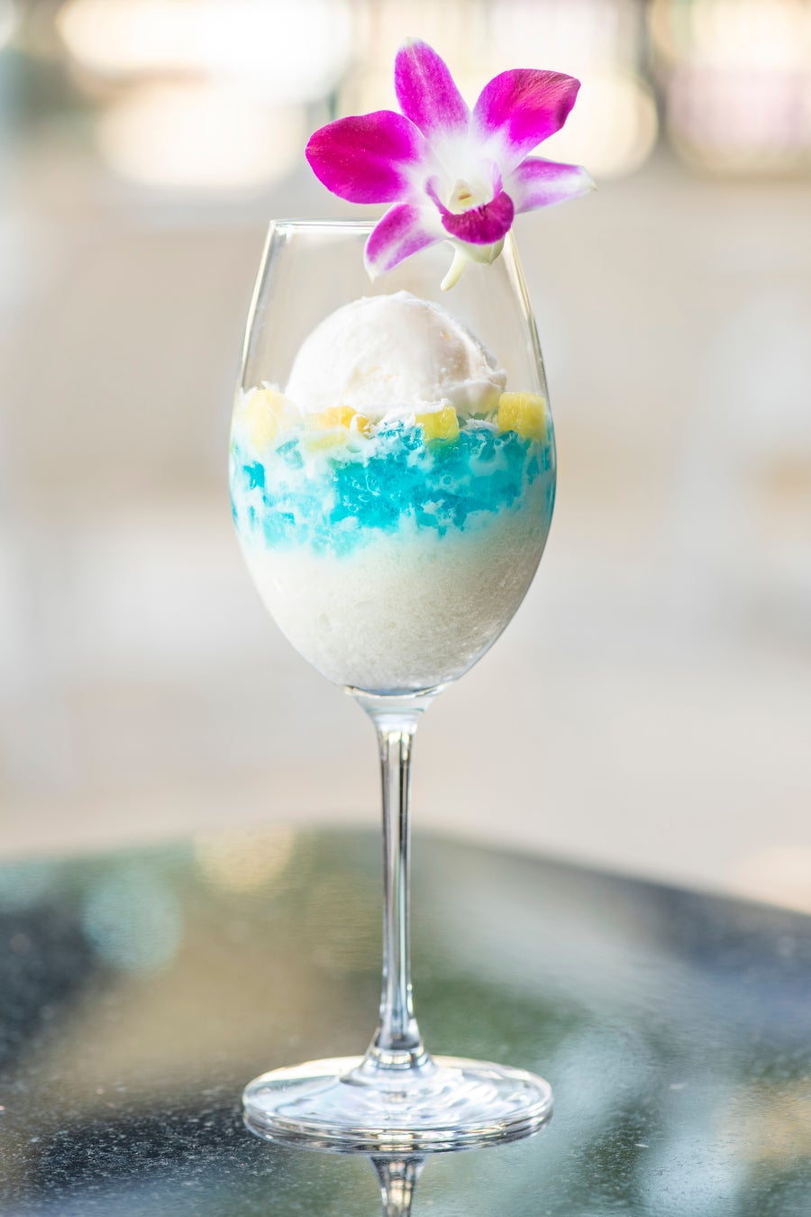 白と青のパラソルや高くそびえるヤシの木に囲まれた、トロピカルムードあふれる空間です。プールサイドでは、オリジナルデザインのシールを自由に貼ることができるスペシャルドリンクや夏らしいシェイブアイスをお召し上がりいただけます。