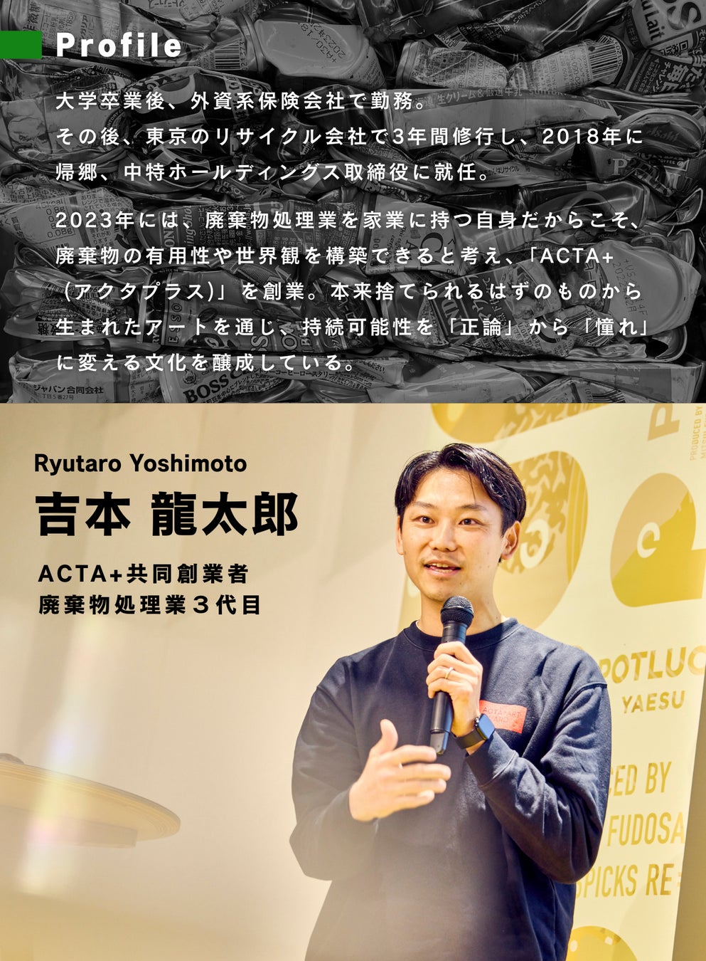 「正論を、憧れに。」を掲げ、捨てられるもの、人から見放されたものからアートを生み出すACTA+は、サステナビリティの正論を『憧れ』に変えることを目指す企業です。