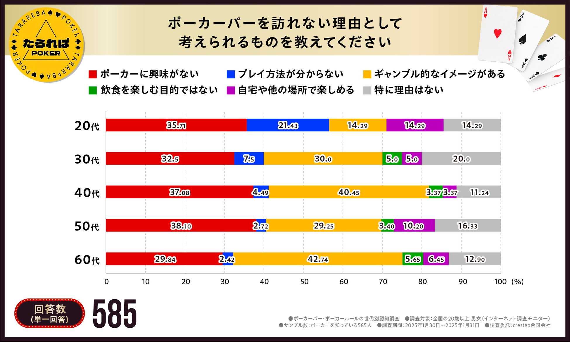 最も全世代の回答割合として高かったのは「ポーカー自体に興味がない」となり、次いで「ギャンブル的な抵抗感」でした。