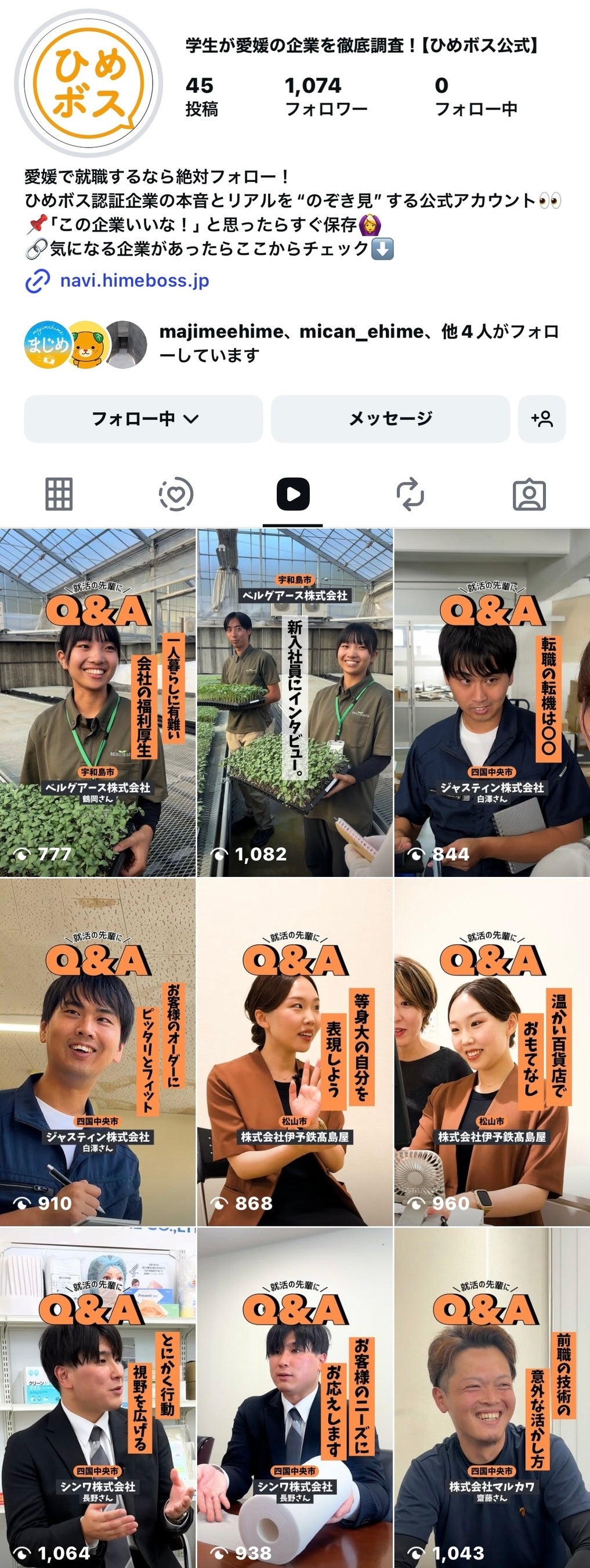 「ひめボス」公式Instagramでは、「ひめボス宣言事業所」となっている県内企業を紹介しています。これらの投稿を通じて、県内就職を検討する大学生に、愛媛で働く人々のリアルな声を届け、就職先選びの一助となることを目指しています。現在は、5社の情報を投稿中です。