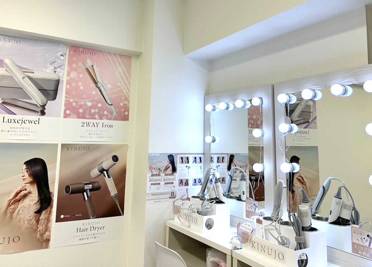 店内のドレッサーには、「超速乾を実現するヘアドライヤー」や「ダメージを抑えながら美しいスタイルを叶えるヘアアイロン」など、KINUJOのヘアケアアイテムを自由にお試しいただけるスペースをご用意。