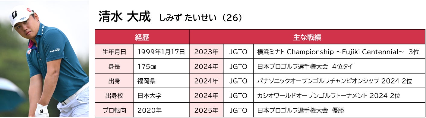 清水選手は、今季最初のメジャー大会となる本大会最終日を首位から3打差でスタートし、最終ホールでは通算14アンダーで並び、プレーオフに突入。本大会史上最長となる4ホールにわたる激闘の末、見事優勝を獲得しました。特にプレーオフ1ホール目では、第1打を右崖下に落とす苦しい場面もありましたが、卓越した技術と持ち前の粘り強さで危機を乗り越え、勝利をつかみ取りました。今回の優勝により獲得した5年間のシード権を活かし、さらなる活躍が期待されます。