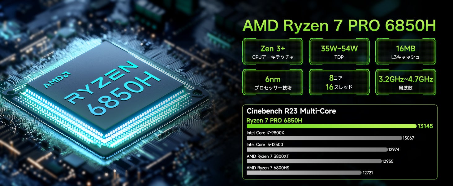 AMD Ryzen 7 PRO 6850Hプロセッサーを搭載し、高負荷作業でも安定して動作します。ゲーミング、ビジネス、そして家庭での使用に最適な1台です。